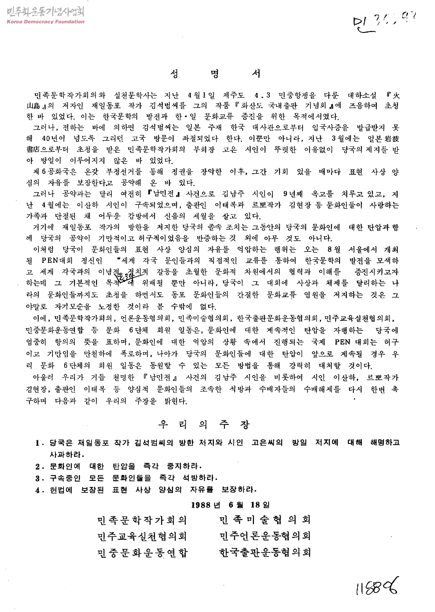 성명서[구속중인 모든문화인들을 석방하고 문화인에 대한 탄압을 즉각 중지하라는 글]