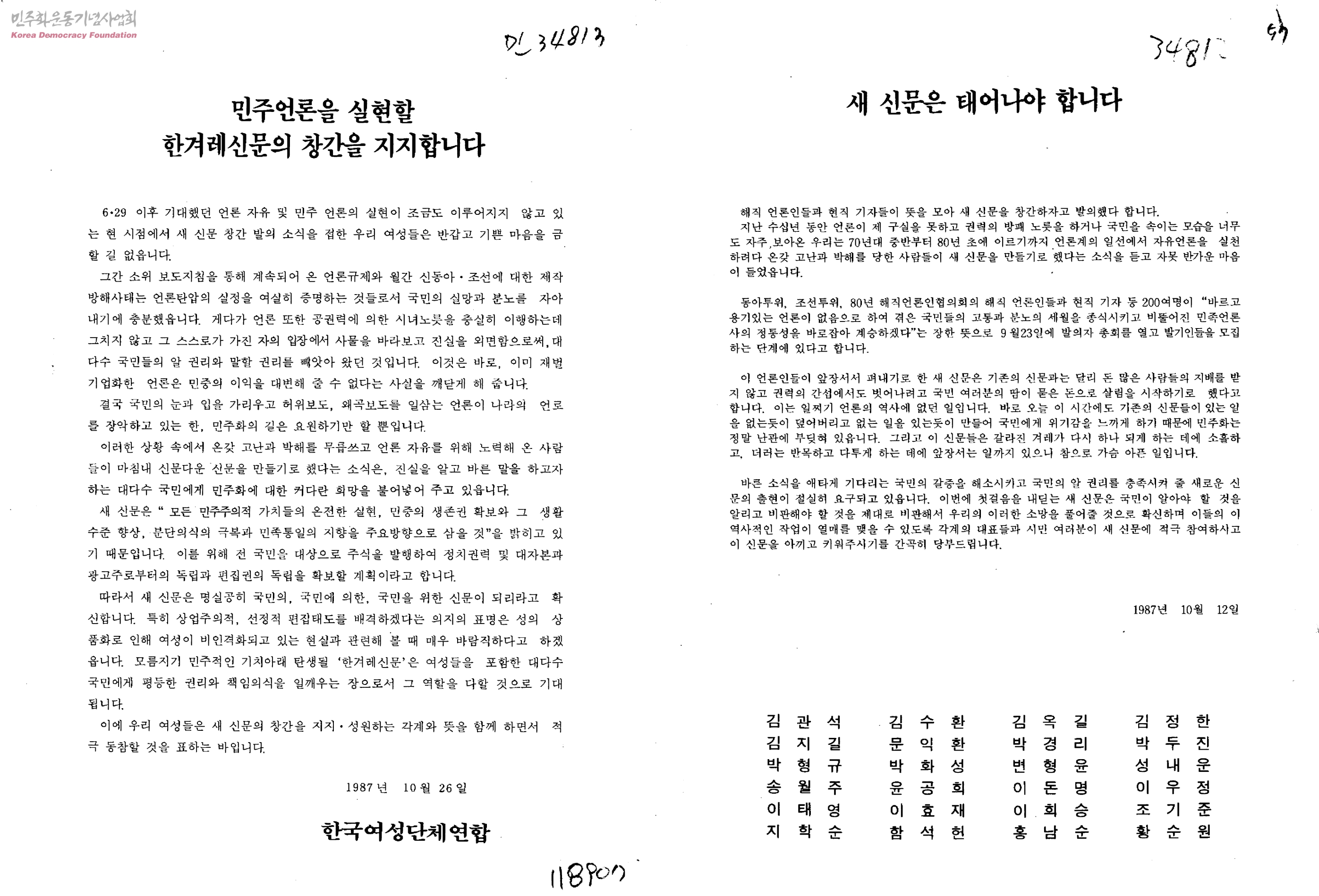 민주언론을 실현할 한겨레신문의 창간을 지지합니다