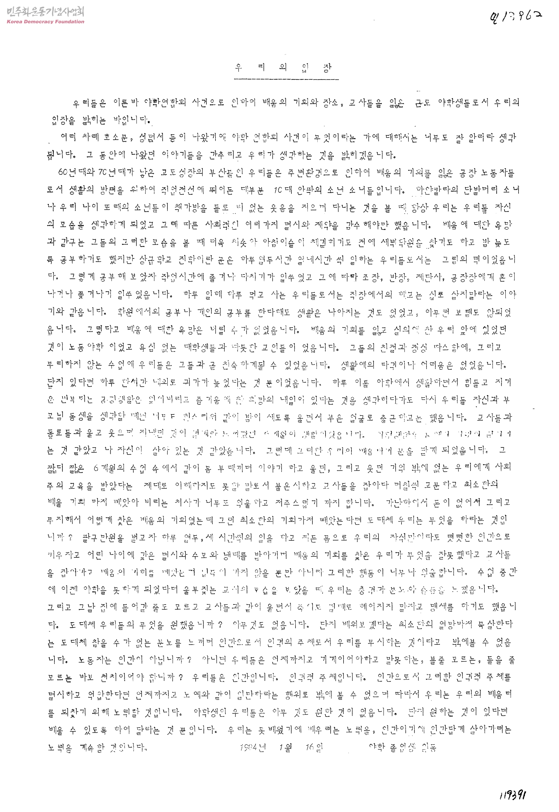 우리의 입장-우리들은 이른바 야학연합회 사건으로 인하여 배움의 기회와 장소, 교사들을 잃은 근로 야학생들로서 우리의 입장을 밝히는 바입니다