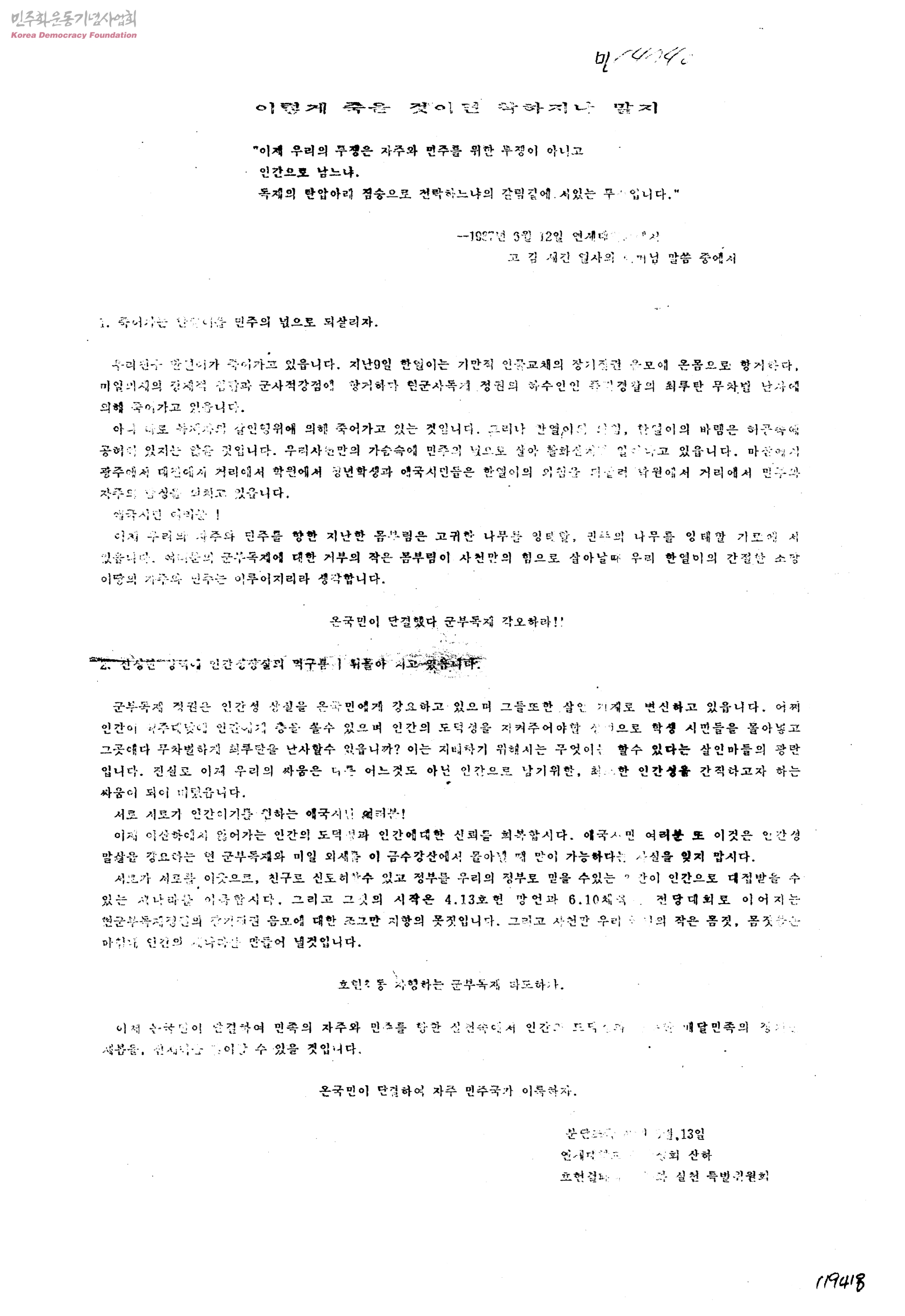 이렇게 죽을 것이면 착하지나 말지-이제 우리의 투쟁은 자주와 민주를 위한 투재잉 아니고 인간으로 남느냐. 독재의 탄압아래 짐승으로 전락하느냐의 갈림길에 서있는 투쟁입니다