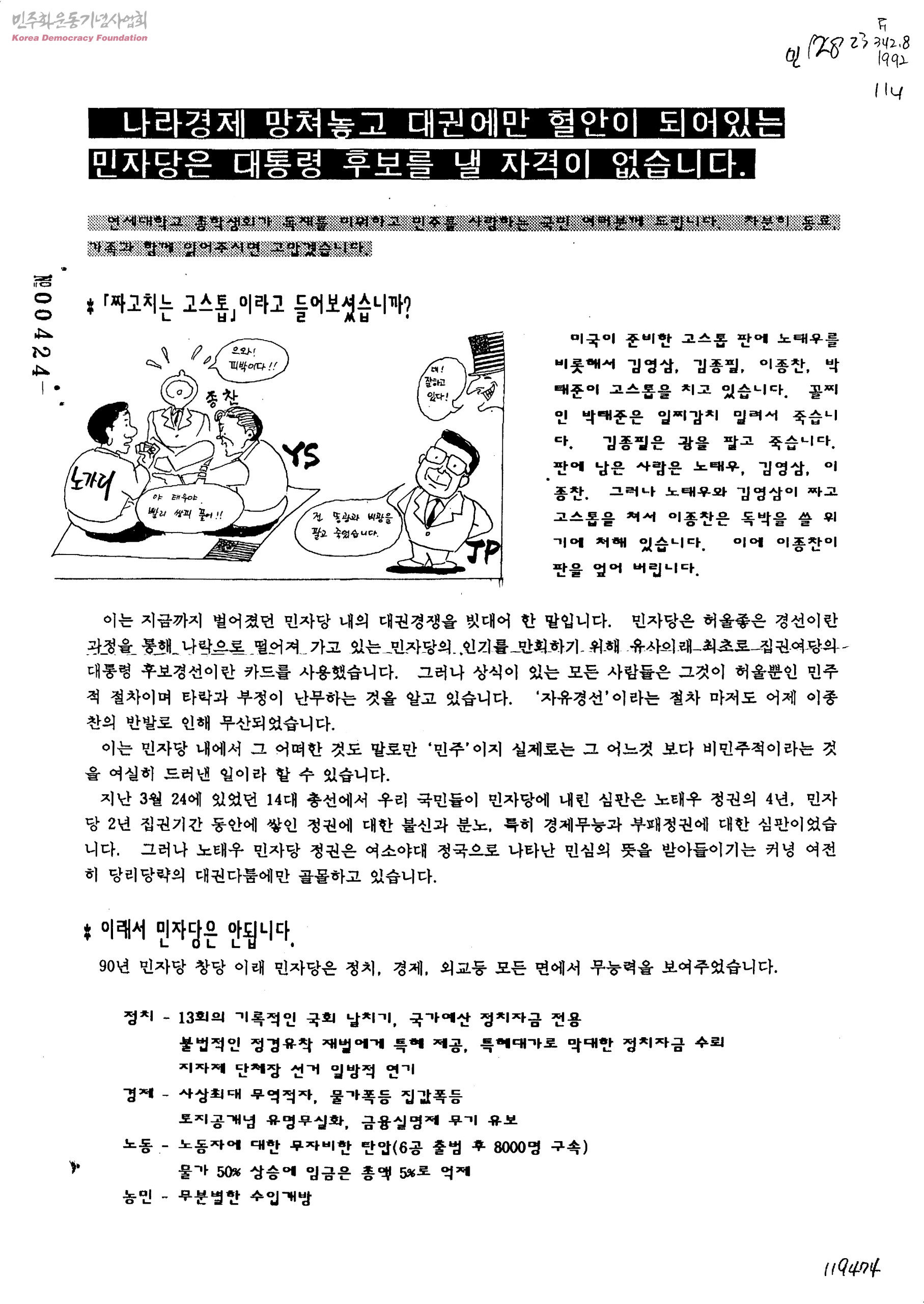 나라경제 망쳐놓고 대권에만 혈안이 되어있는 민자당은 대통령 후보를 낼 자격이 없습니다