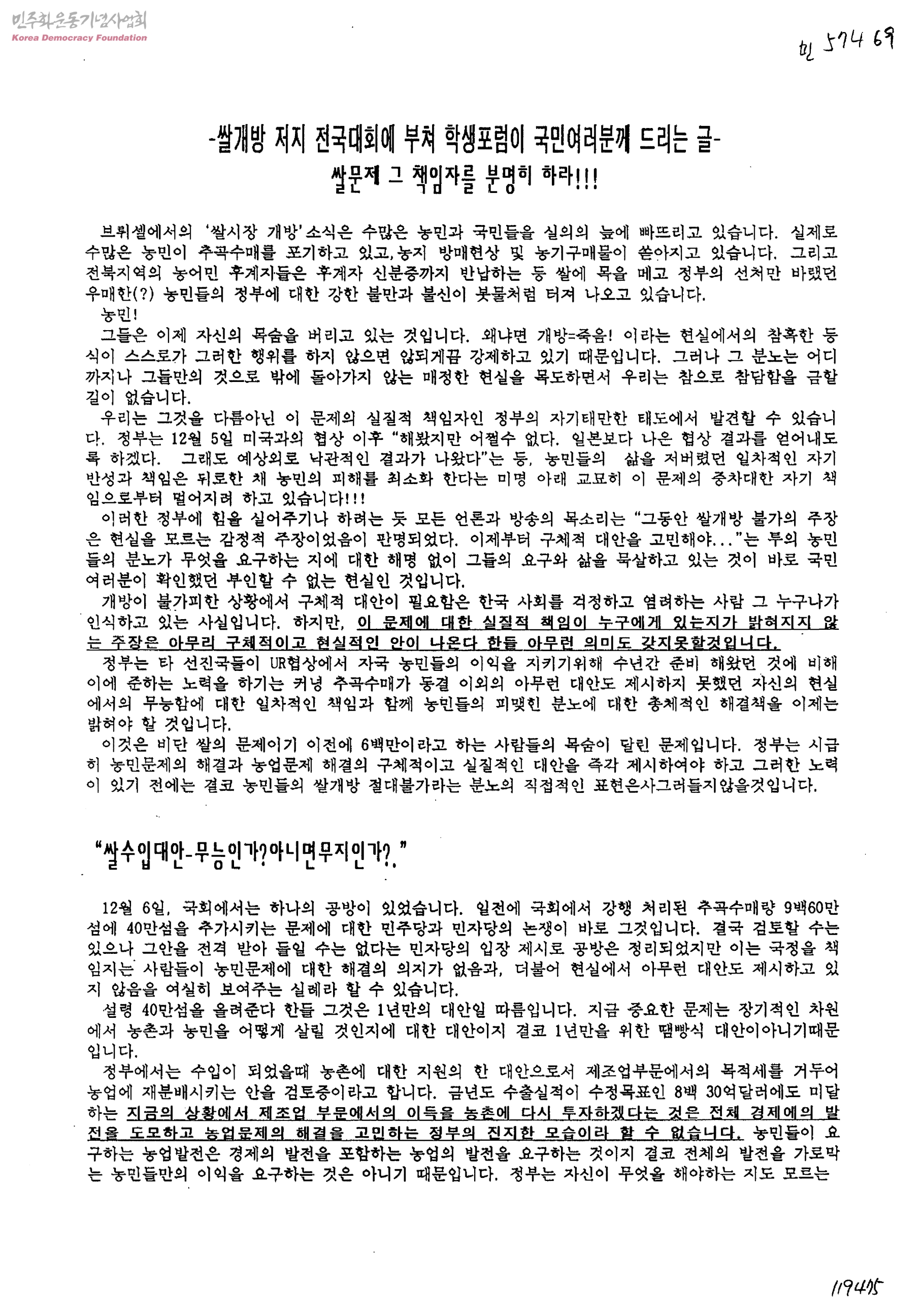 쌀개방 저지 전국대회에 부쳐 학생포럼이 국민여러분께 드리는 글-쌀문제 그 책임자를 분명히 하라