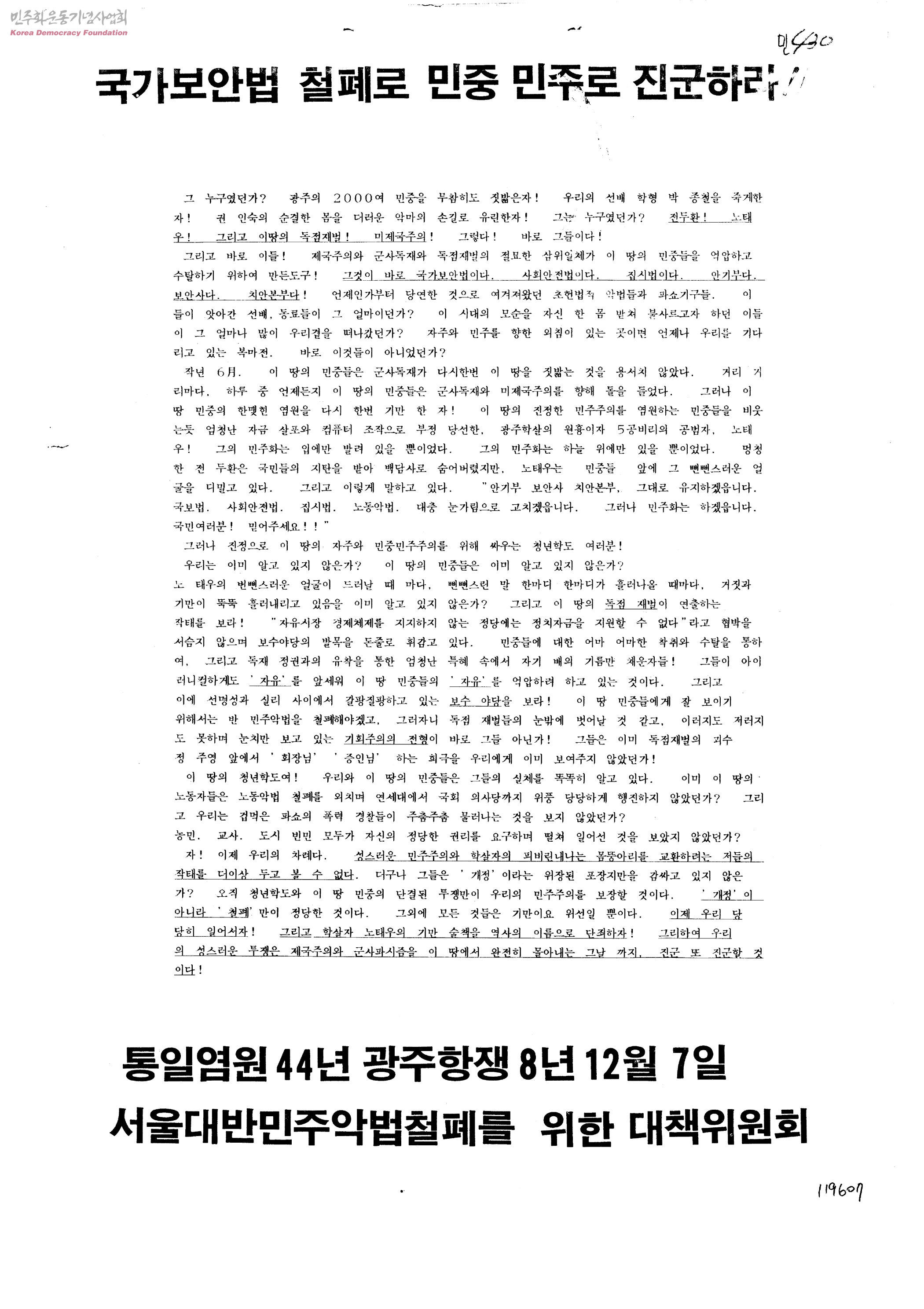 국가보안법 철폐로 민중 민주로 진군하라-국가보안법 철폐를 위한 청년학도 결의대회