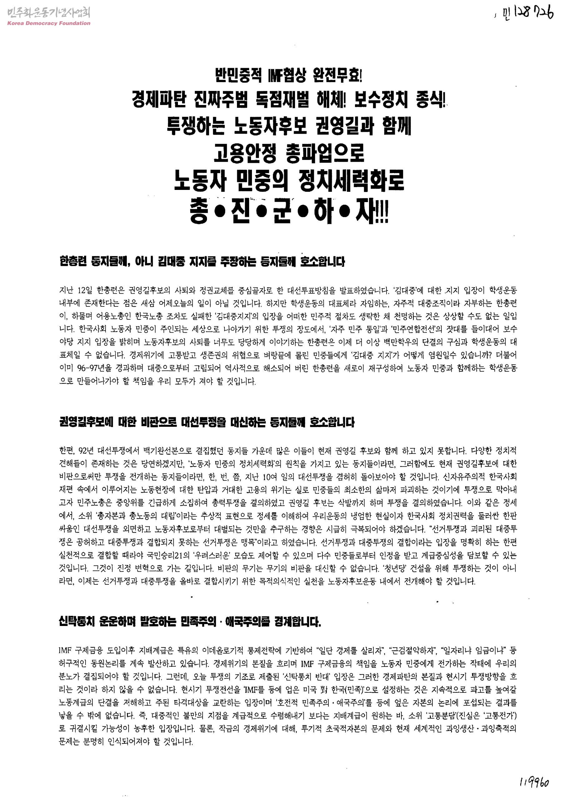 반민중정 IMF협상 완전무효! 경제파탄 진짜주범 독점재벌 해체! 보수정치 종식!투쟁하는 노동후보 권영길과 함께 고용안정 총파업으로 노동자 민주의 정치세력화로 총ㆍ진ㆍ군ㆍ하ㆍ자