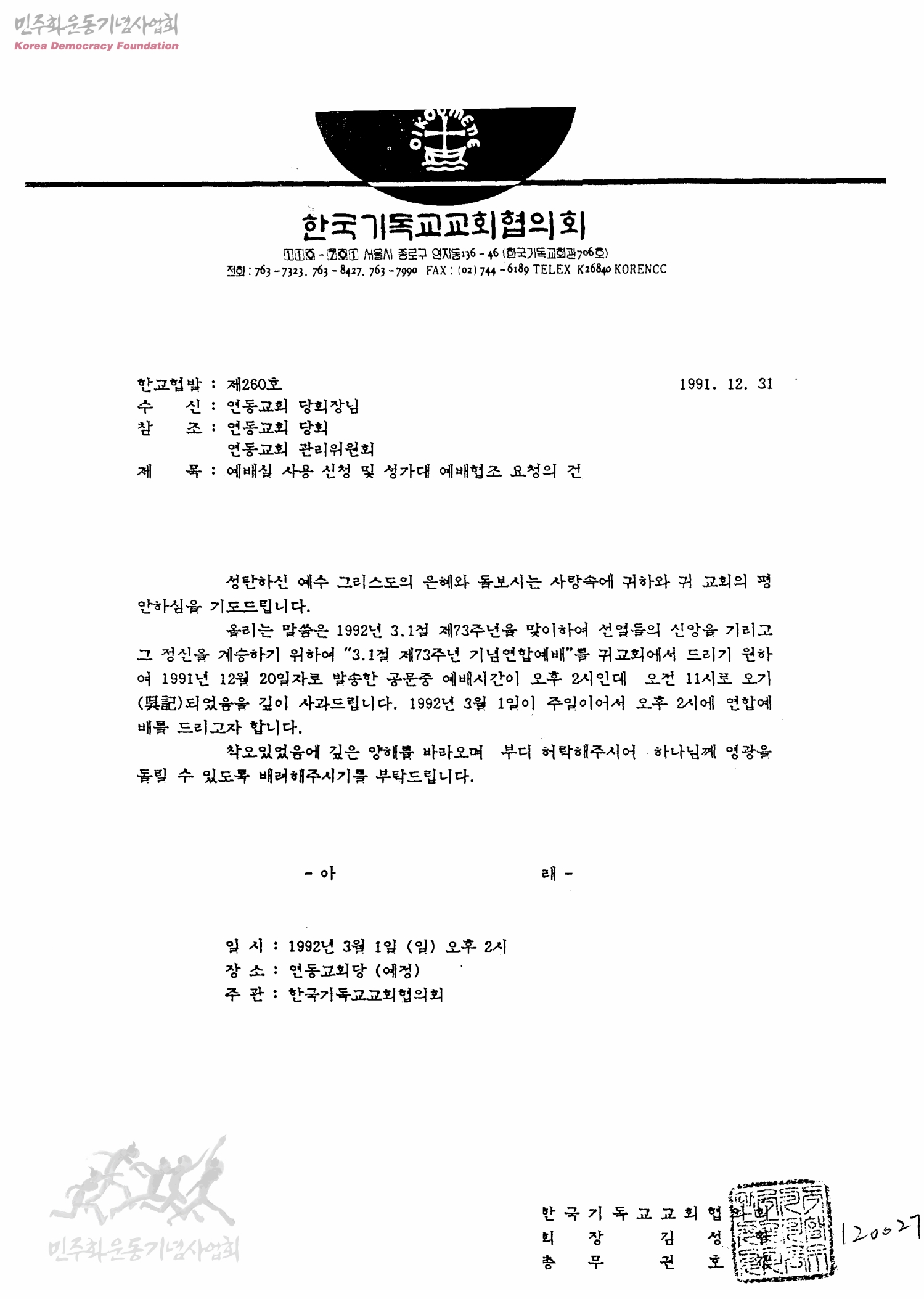예배실 사용 신청 및 성가대 예배협조 요청의 건[수신:연동교회 당회장님]