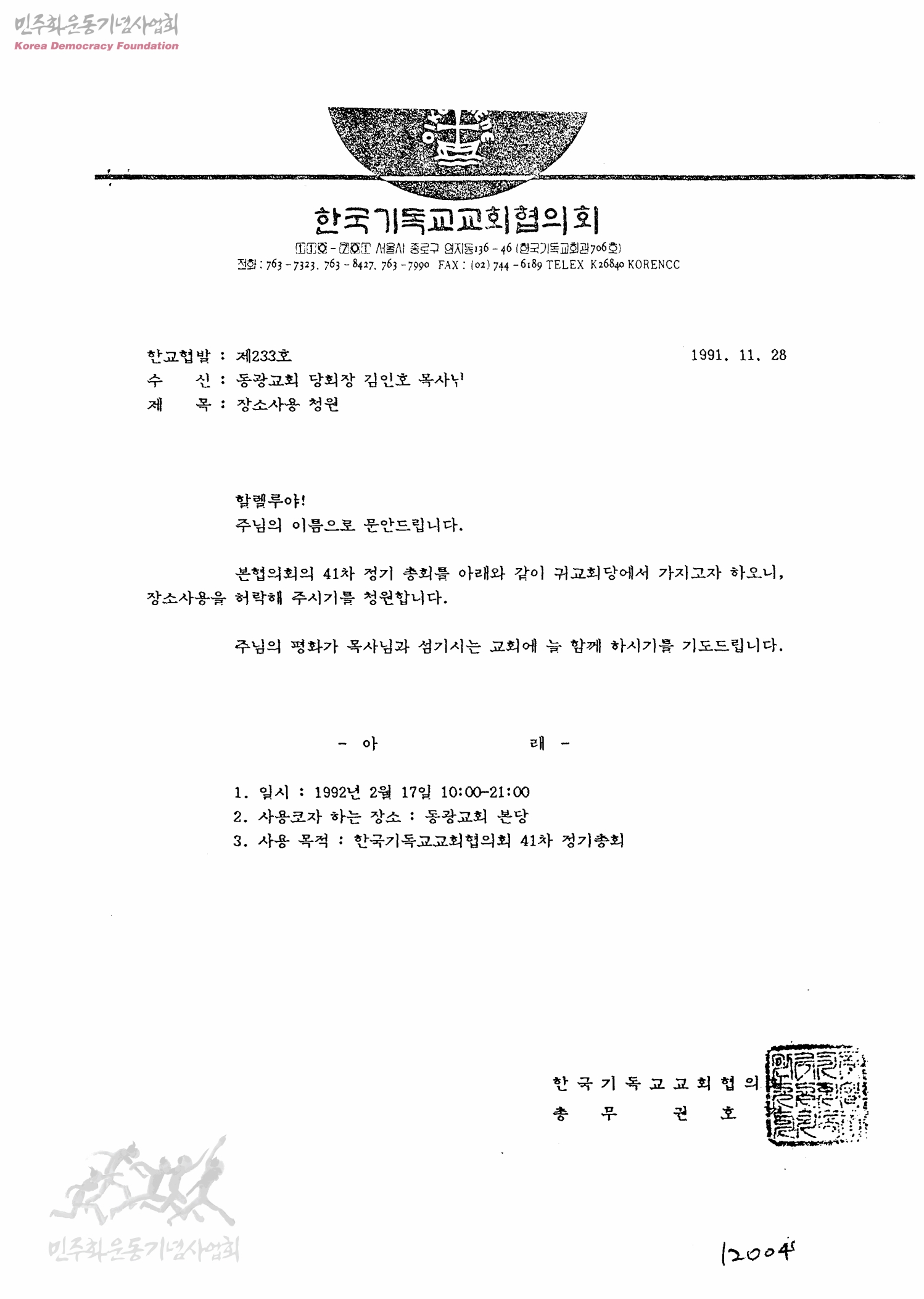 장소사용 청원[수신:동광교회 당회장 김인호 목사님]