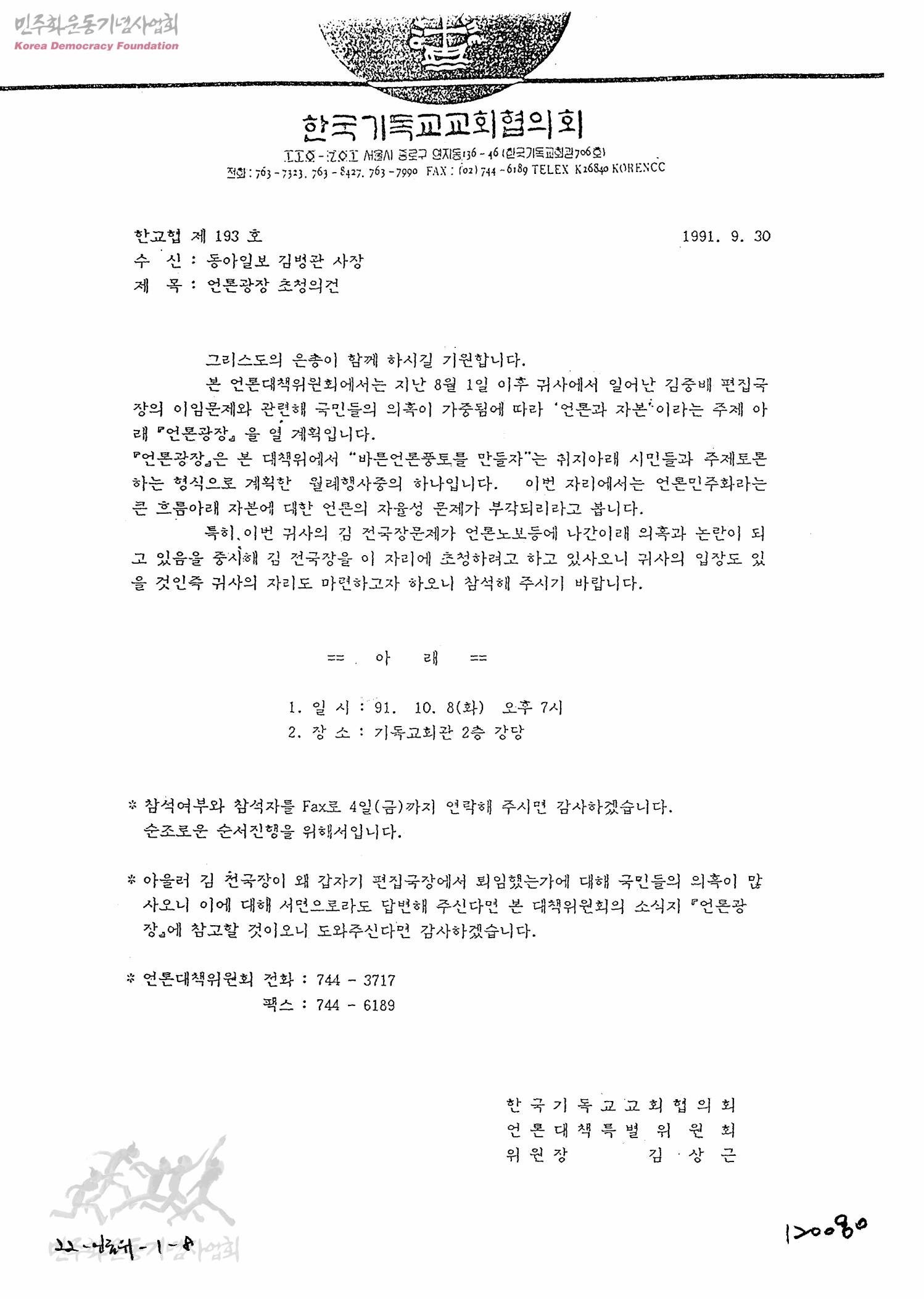 언론광장 초청의건[수신:동아일보 김병관사장]