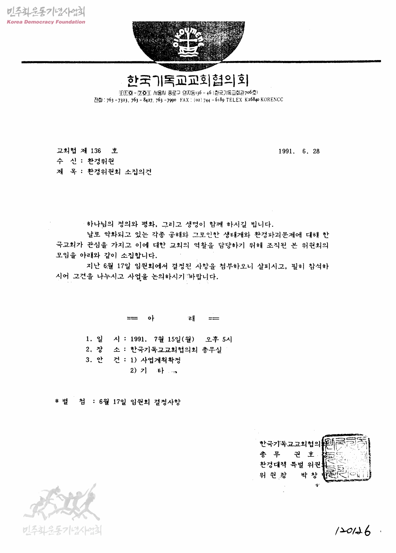 - 한국기독교교회협의회 총무 환경대책특별위원회 위원장