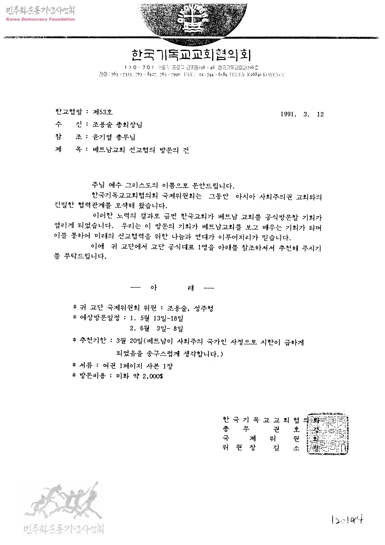 베트남교회 선교협의 방문의 건[수신:조용술 총회장, 발신: 한국기독교교회협의회]