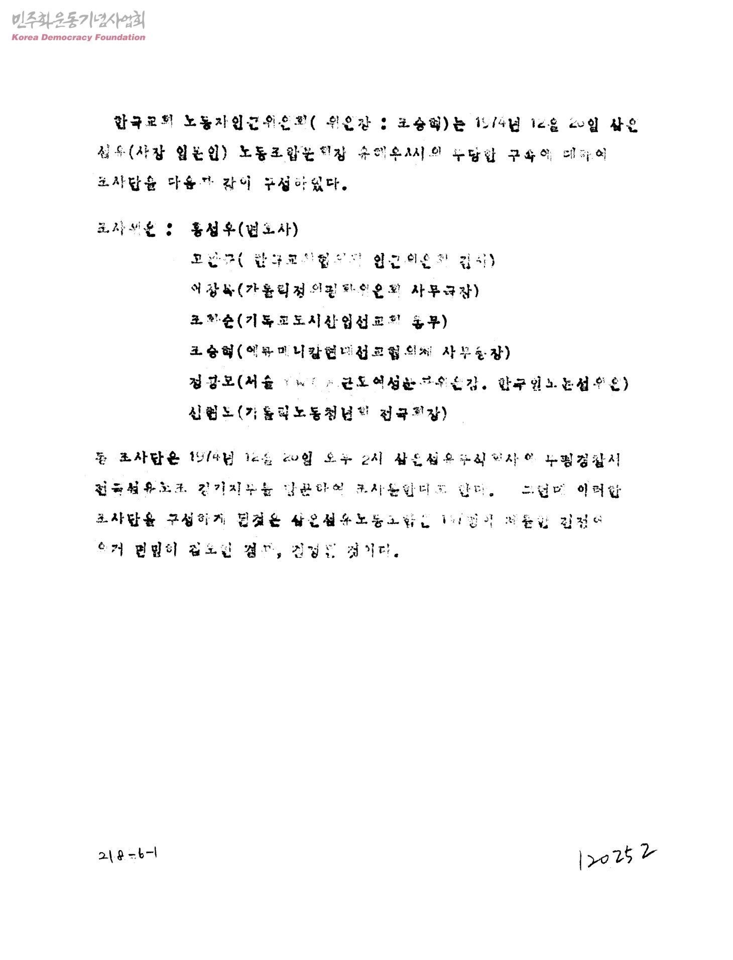 [삼원섬유 노동조합분회장 유해우씨의 부당구속에 대해 조사단 구성에 대한 보고서]