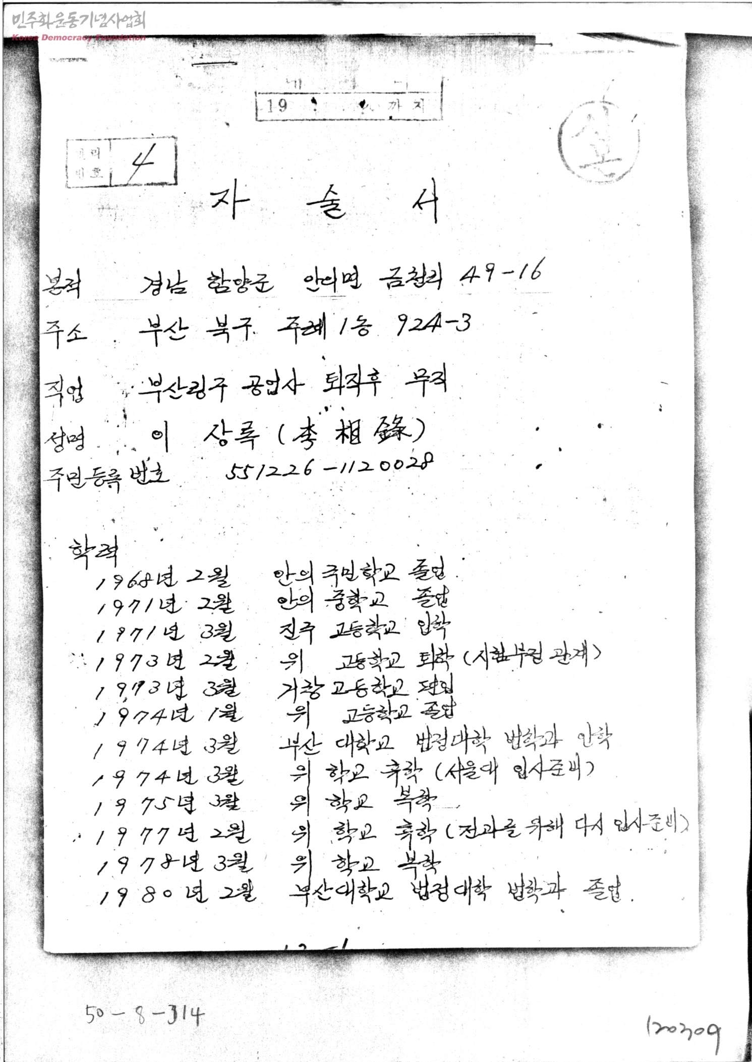 자술서[반공법위반등으로 구속된 이상록씨가 작성한 자술서]