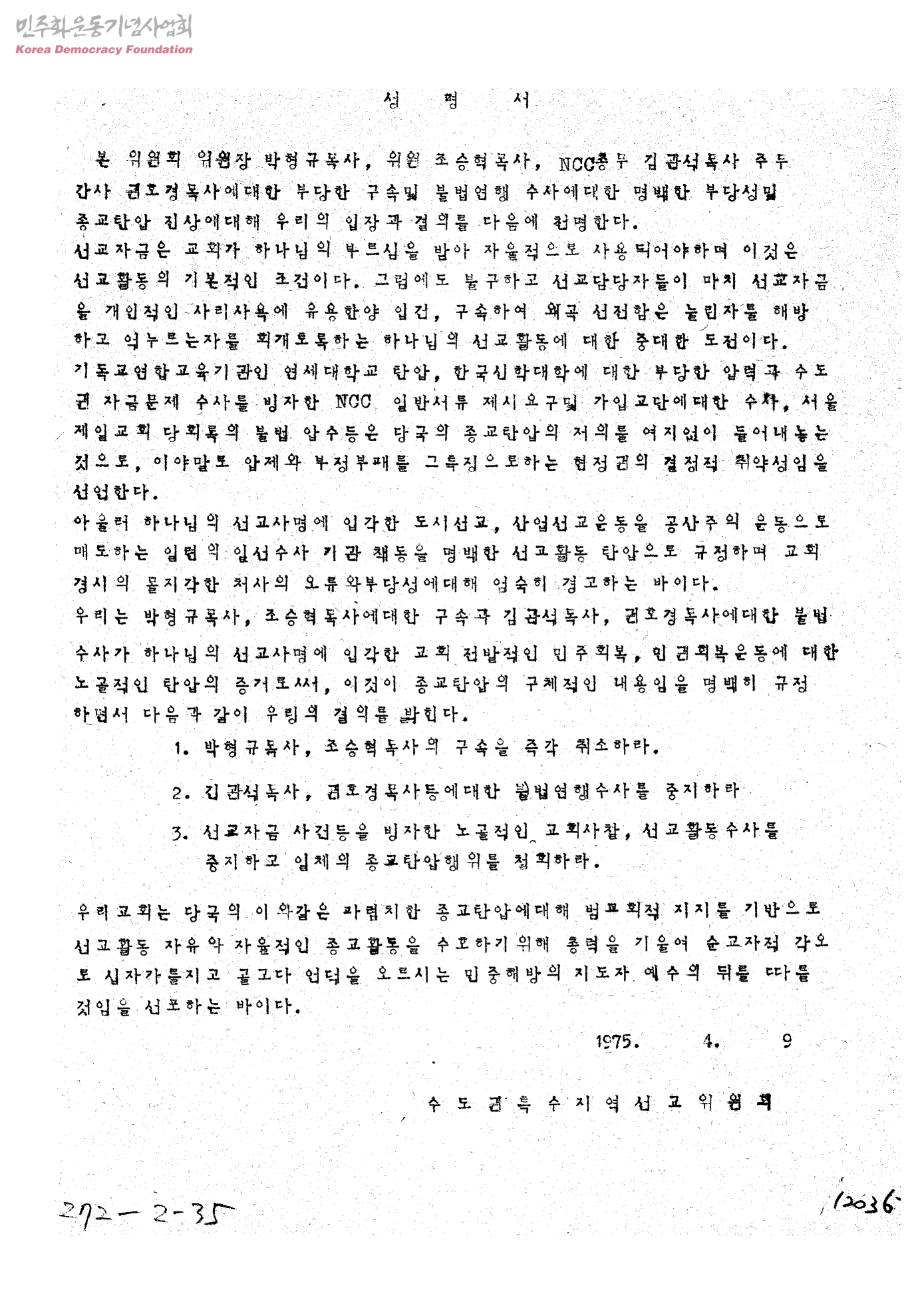 [박형규목사, 조승혁목사, 김관석목사, 권호경목사에 대한 부당한 구속및 불법연행수사에 관련된 성명서]