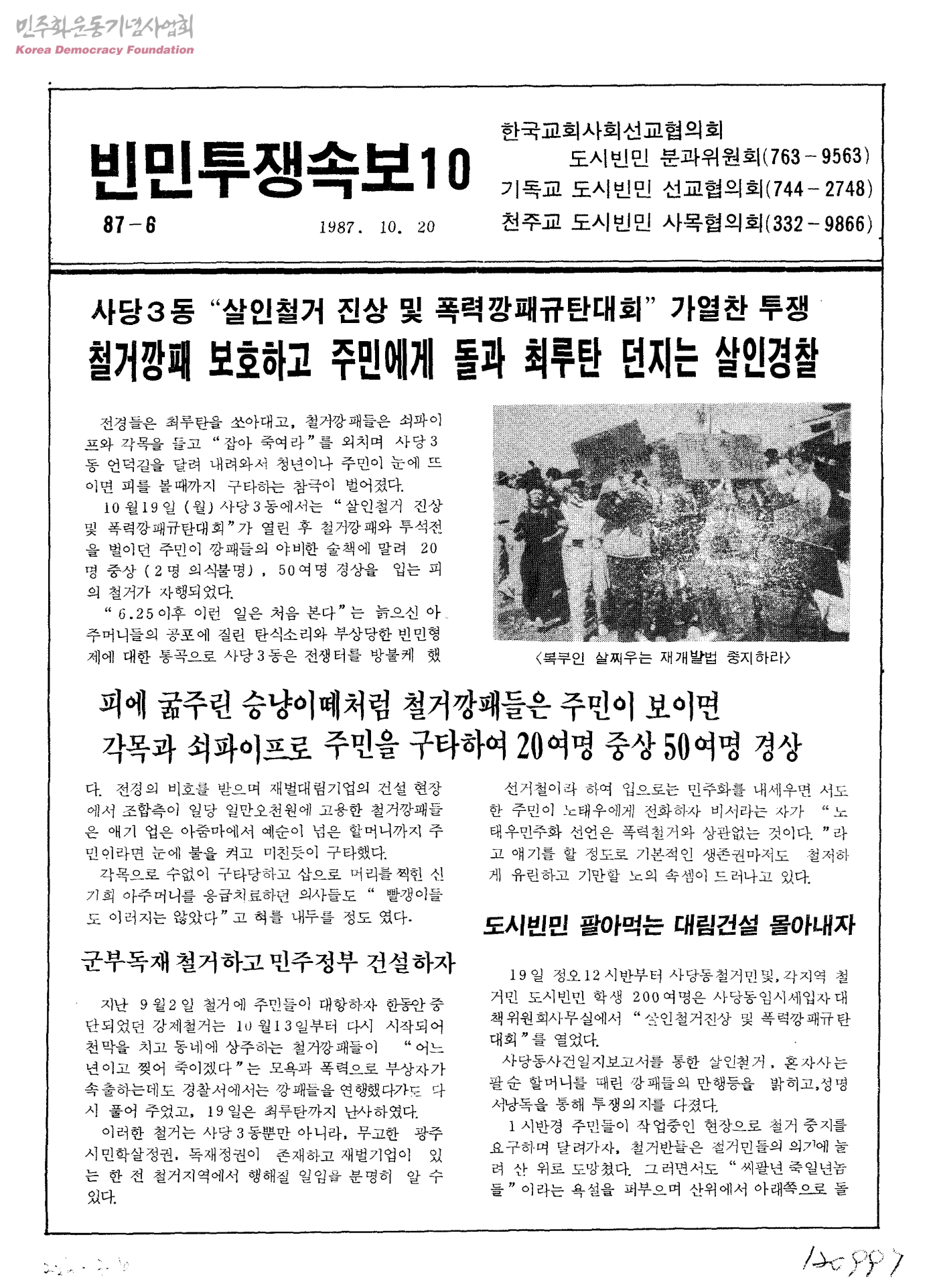빈민투쟁속보 10-사당3동 "살인철거 진상 및 폭력깡패규탄대회" 가열찬 투쟁 철거깡패 보고하고 주민에게 돌과 최루탄 던지는 살인경찰