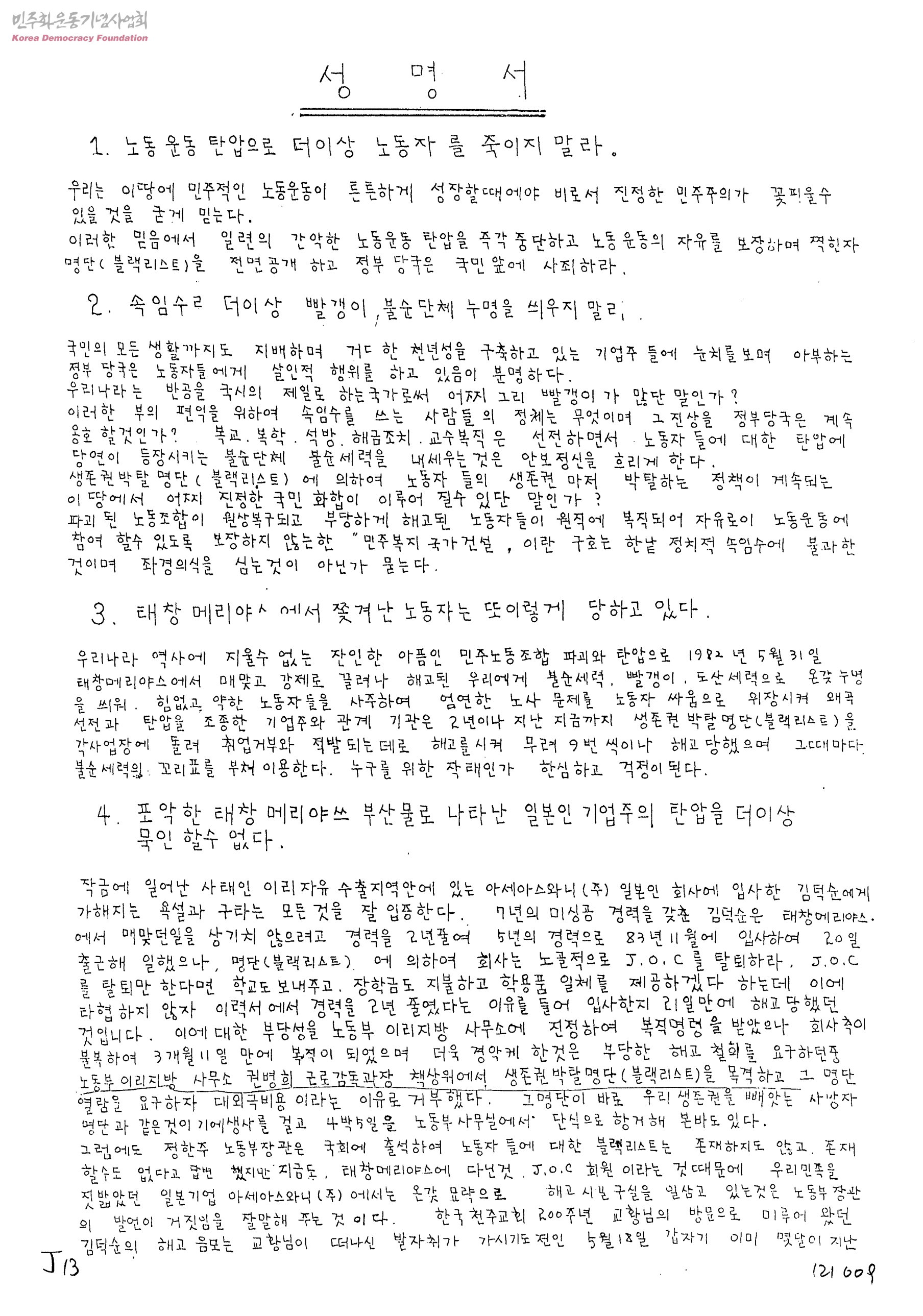 성명서[태창메리야스 해고자 복직,노동악볍전면개정관련]