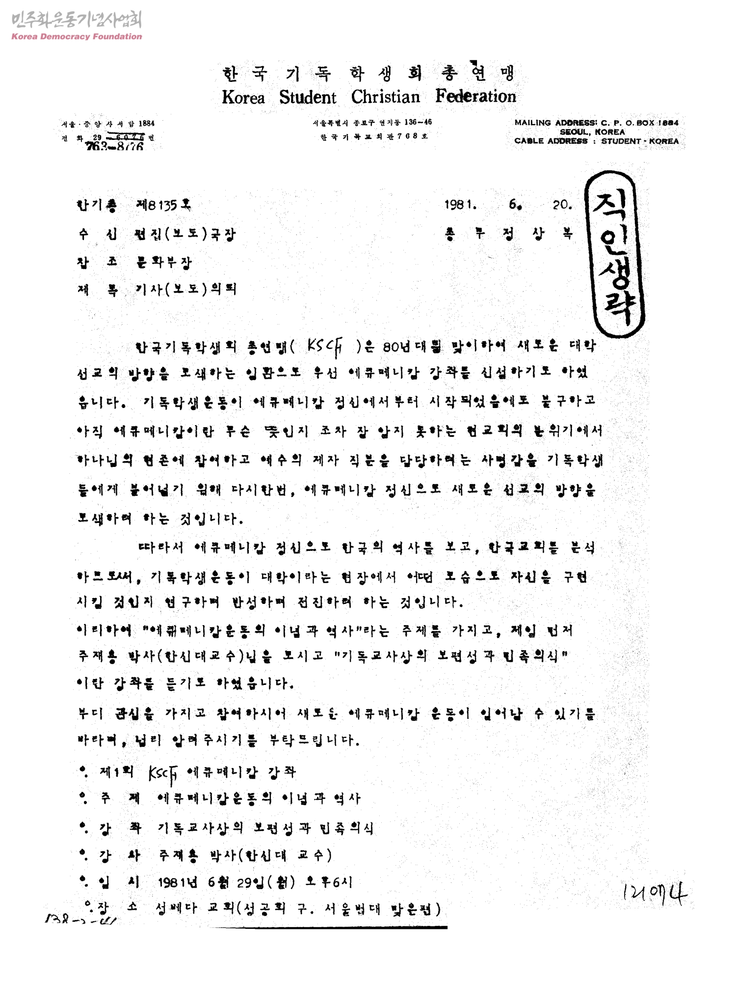 기사(보도)의뢰[제1회 KSCF 에큐메니칼 강좌][수신:편집(보도)국장]