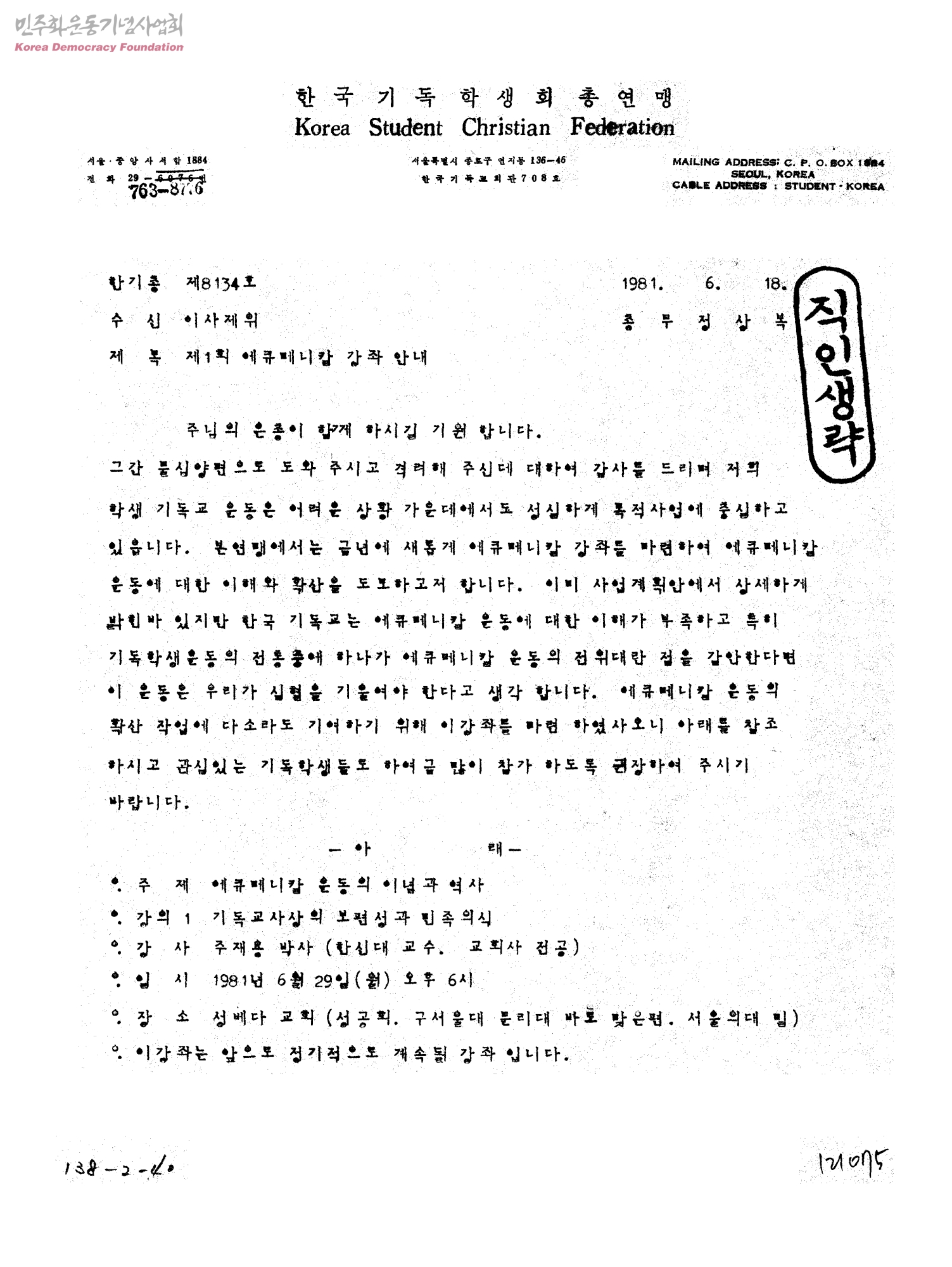 제1회 에큐메니칼 강좌 안내[수신:이사제위]