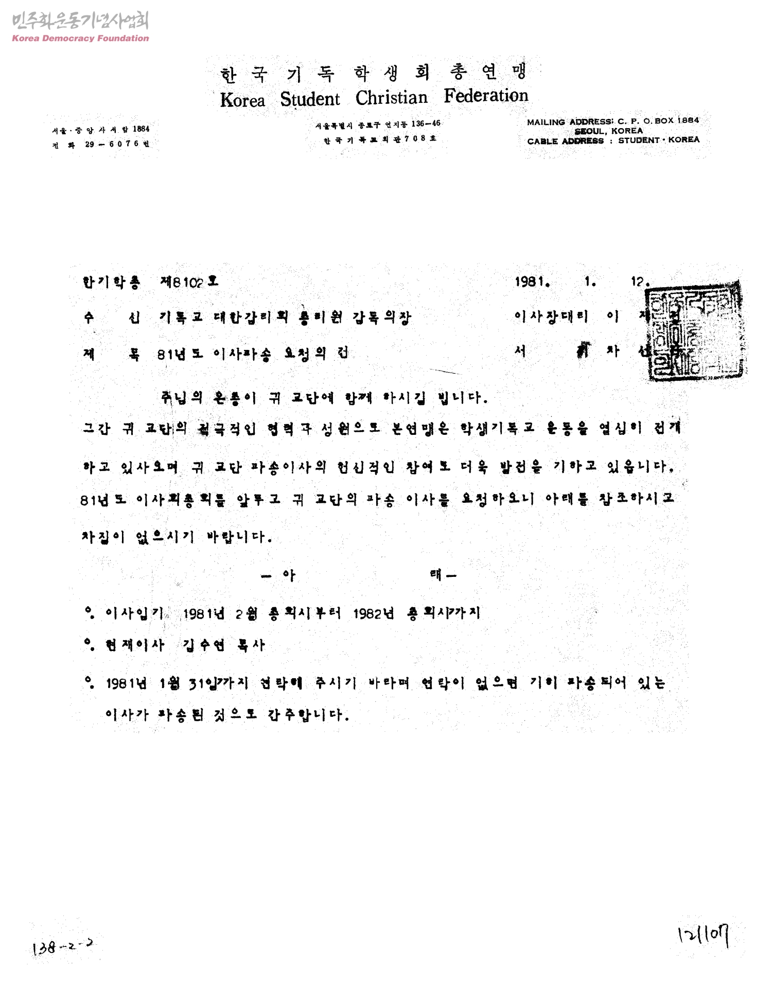 81년도 이사파송 요청의 건[수신:기독교대한감리회 총리원 감독의장]