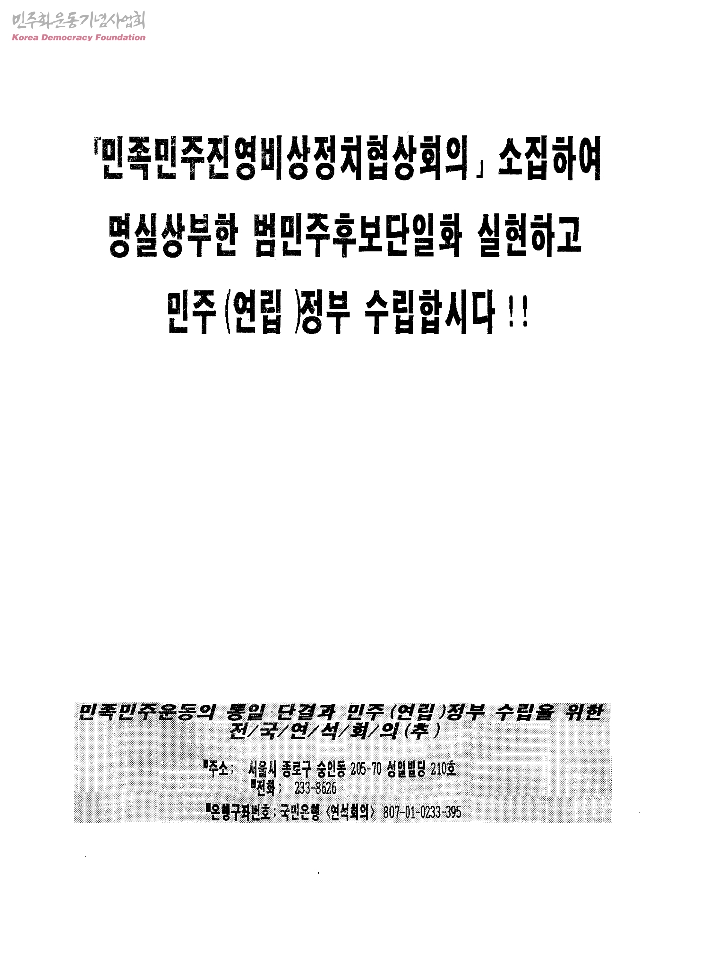 민족민주진영비상정치협상회의 소집하여 명실상부한 범민주후보단일화 실현하고 민주(연립)정부 수립합시다