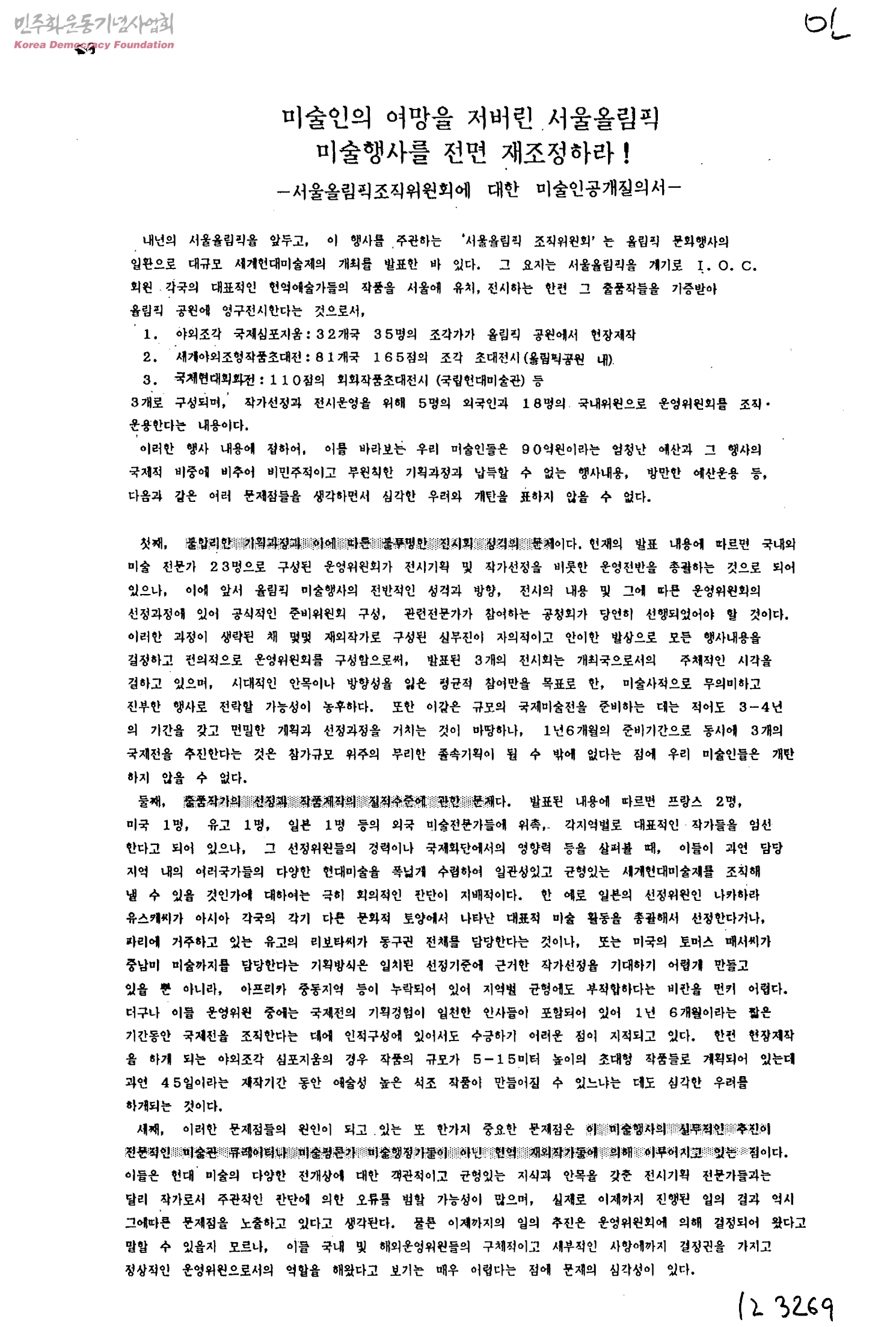 미술인의 여망을 저버린 서울올림픽 미술행사를 전면 재조정하라!-서울올림픽조직위원회에 대한 미술인공개질의서