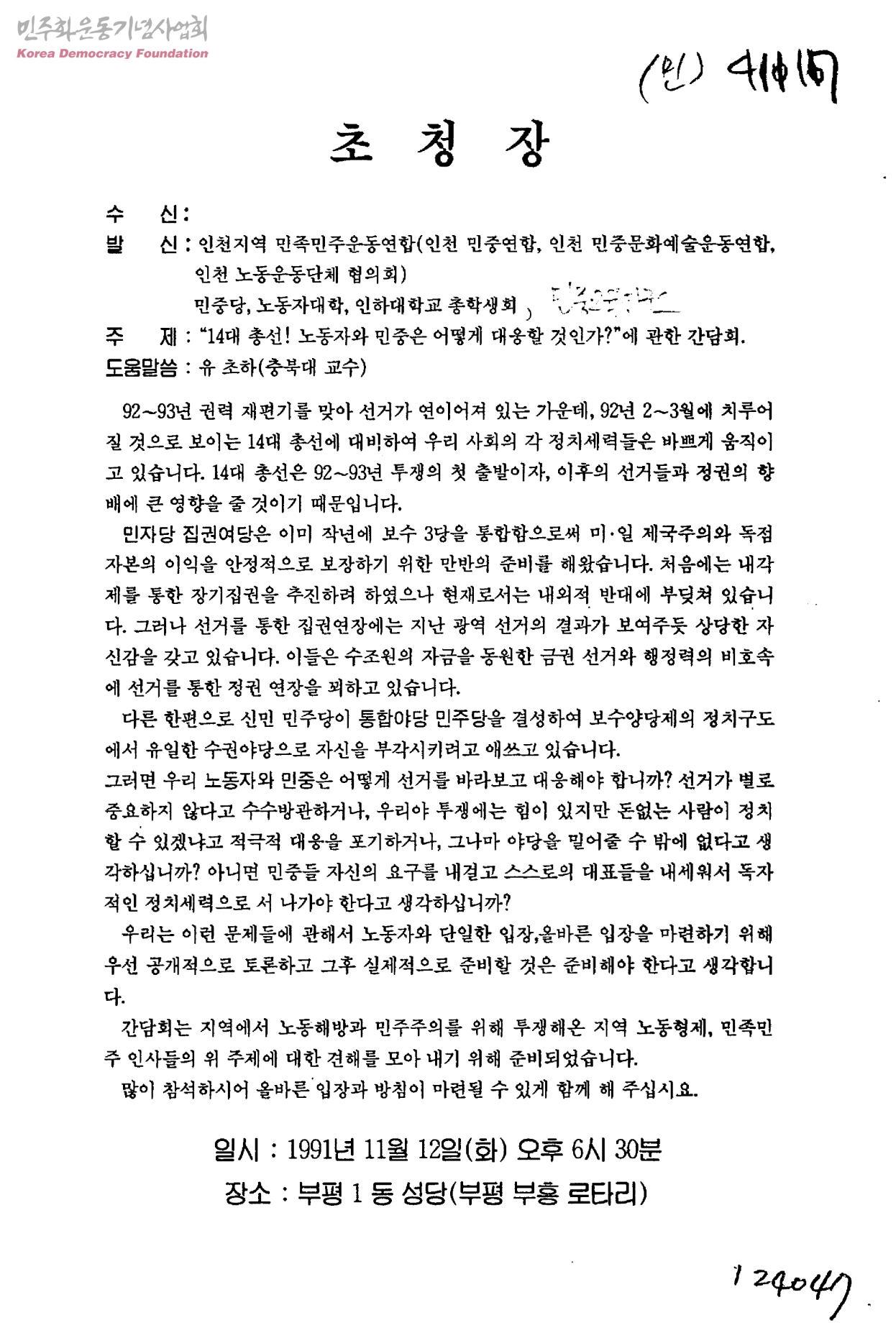 초청장[14대 총선 노동자와 민중은 어떻게 대응할 것인가]