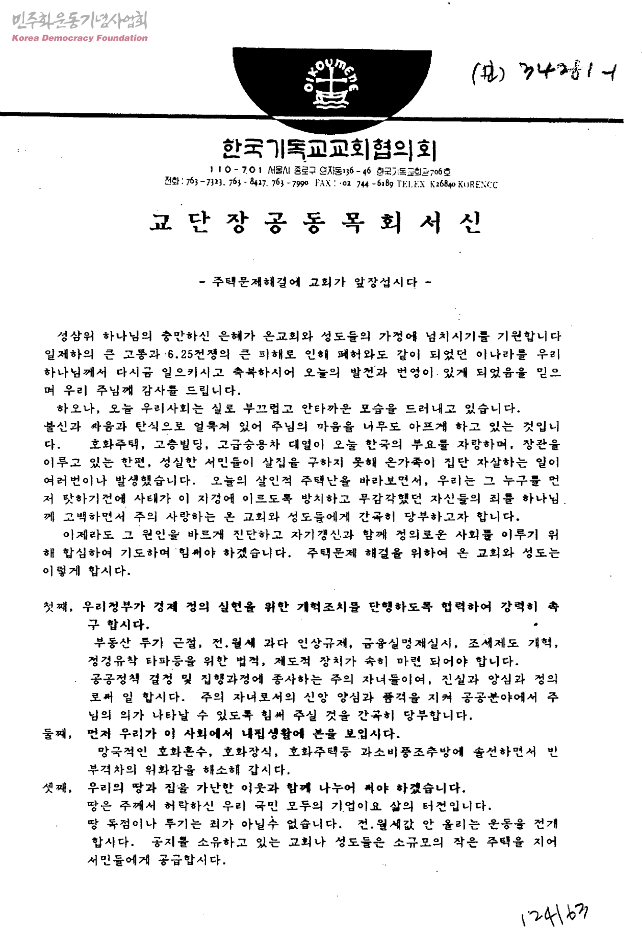 교단장공동목회서신[주택문제해결에 교회가 앞장섭시다]