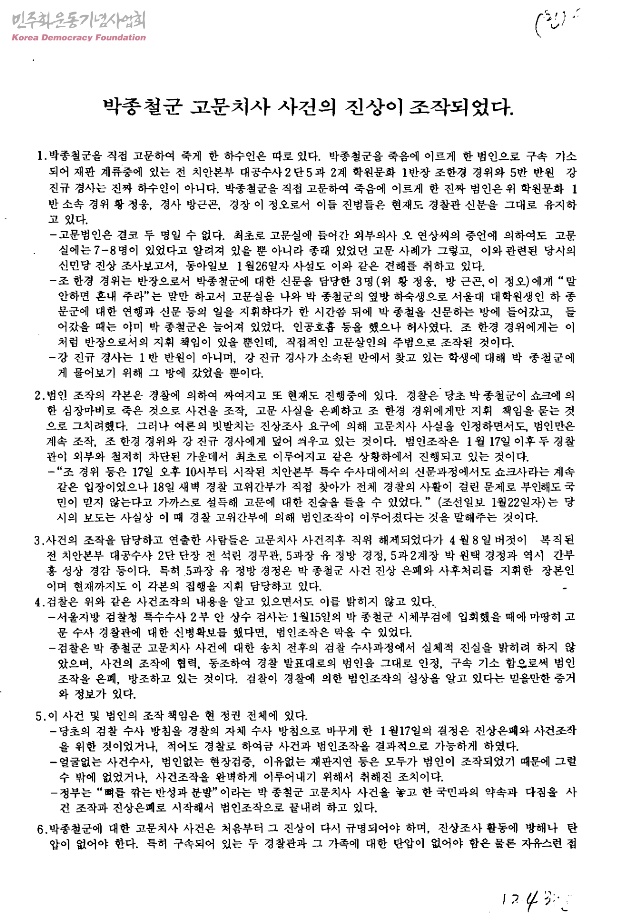 박종철군 고문치사 사건의 진상이 조작되었다