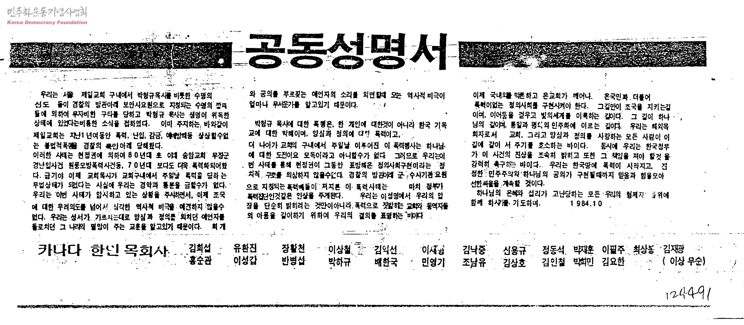 - 카나다한인목회자 김희섭, 유환진, 장활천, 이상철, 김익선, 이재형, 김낙중, 신용규, 정동석, 박재훈, 이필주, 최상봉, 김재광, 홍순관, 이성갑, 반병섭, 박하규, 배한국, 민영기, 조남유, 김상호, 김인철, 박희민, 김요한