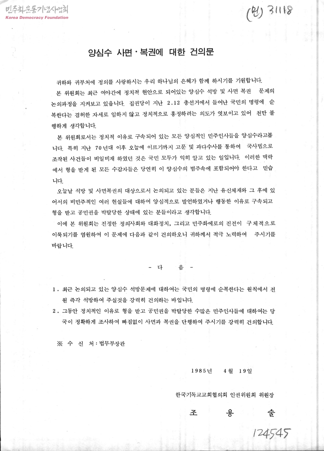 - 최근에 논의되고 있는 양심수 석방문제에 대하여는 국민의 명령에 순복한다는 원칙에서 전원 즉각 석방을 강력히 건의하고 그동안 정치적인 이유로 형을 받고 공민권을 박탈당한 수많은 민주인사들에 대하여는 당국이 정확하게 조사하여 빠짐없이 사면과 복권을 단행하길 건의함