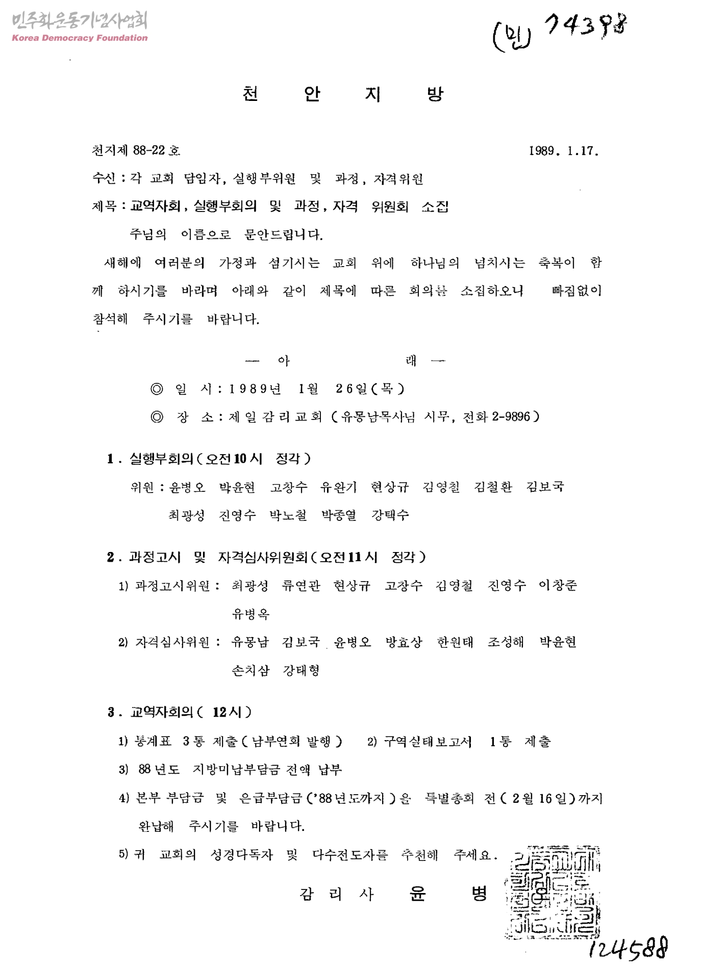 천안지방 교역자회, 실행부회의 및 과정, 자격 위원회 소집[수신:각 교회 담임자, 실행부위원 및 과정, 자격위원, 발신:천안지방 감리사 윤병오]