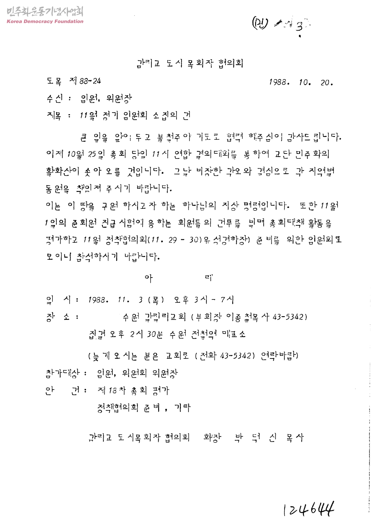 11월 정기 임원회 소집의 건[수신:임원, 위원장, 발신:김리교도시목회자협의회]