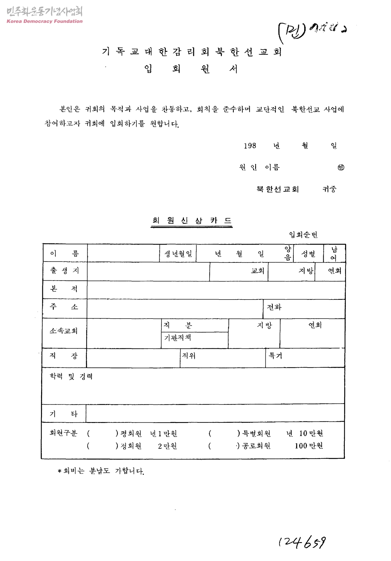 기독교대한감리회북한선교회 입회원서