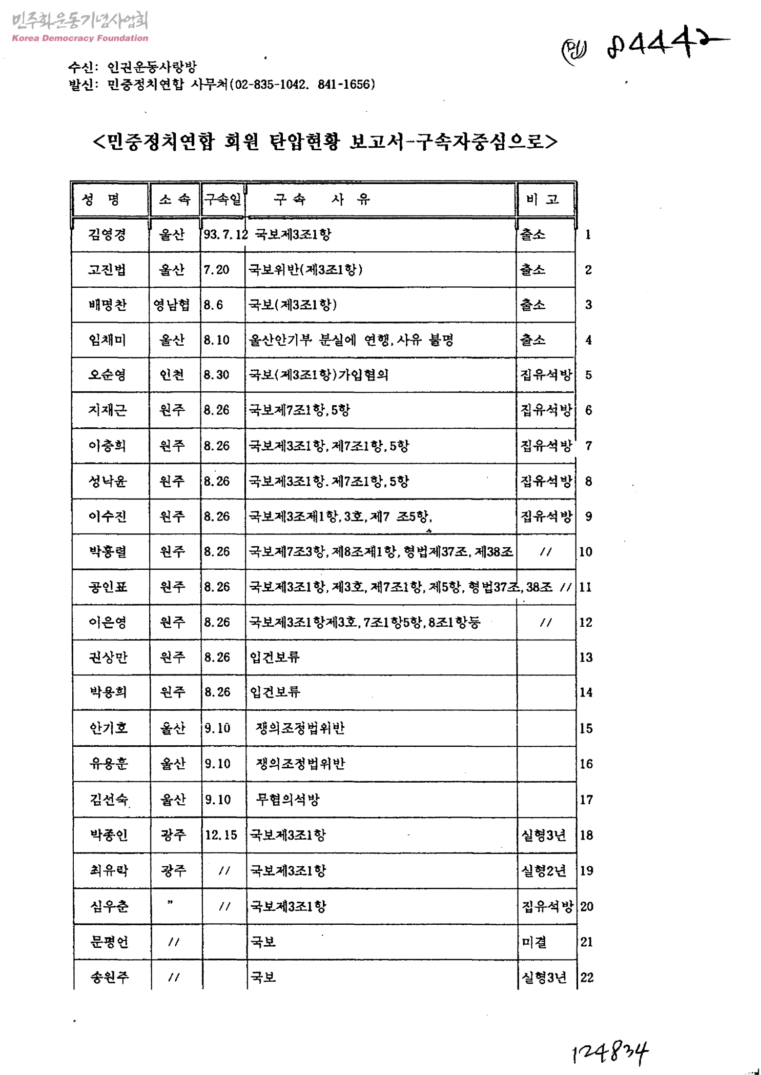 민중정치연합 회원 탄압현황 보고서-구속자중심으로[수신:인권운동사랑방, 발신:민중정치연합사무처]