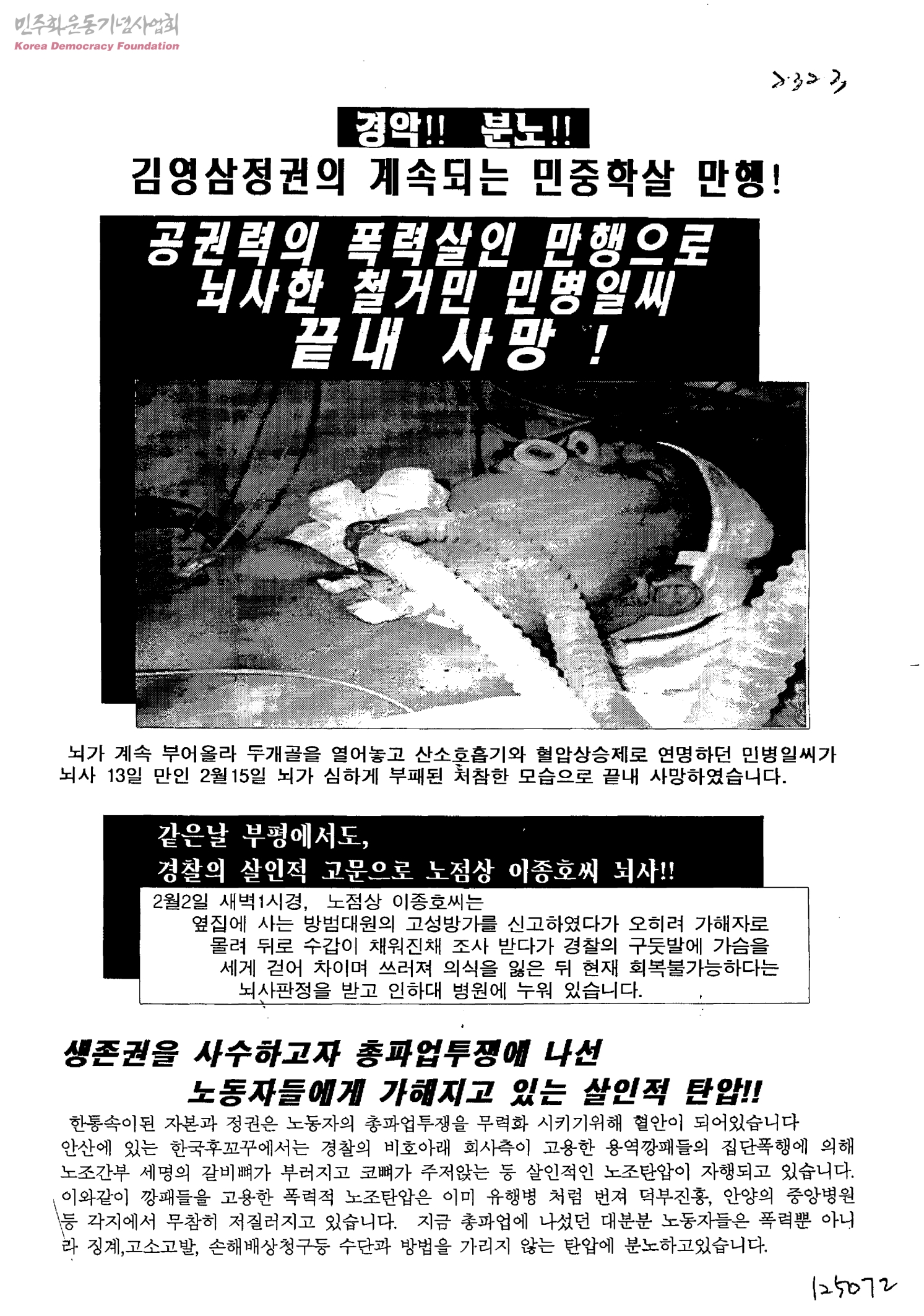 김영삼정권의 계속되는 민중학살 만행-공권력의 폭력살인 만행으로 뇌사한 철거민 민병일씨 끝내 사망
