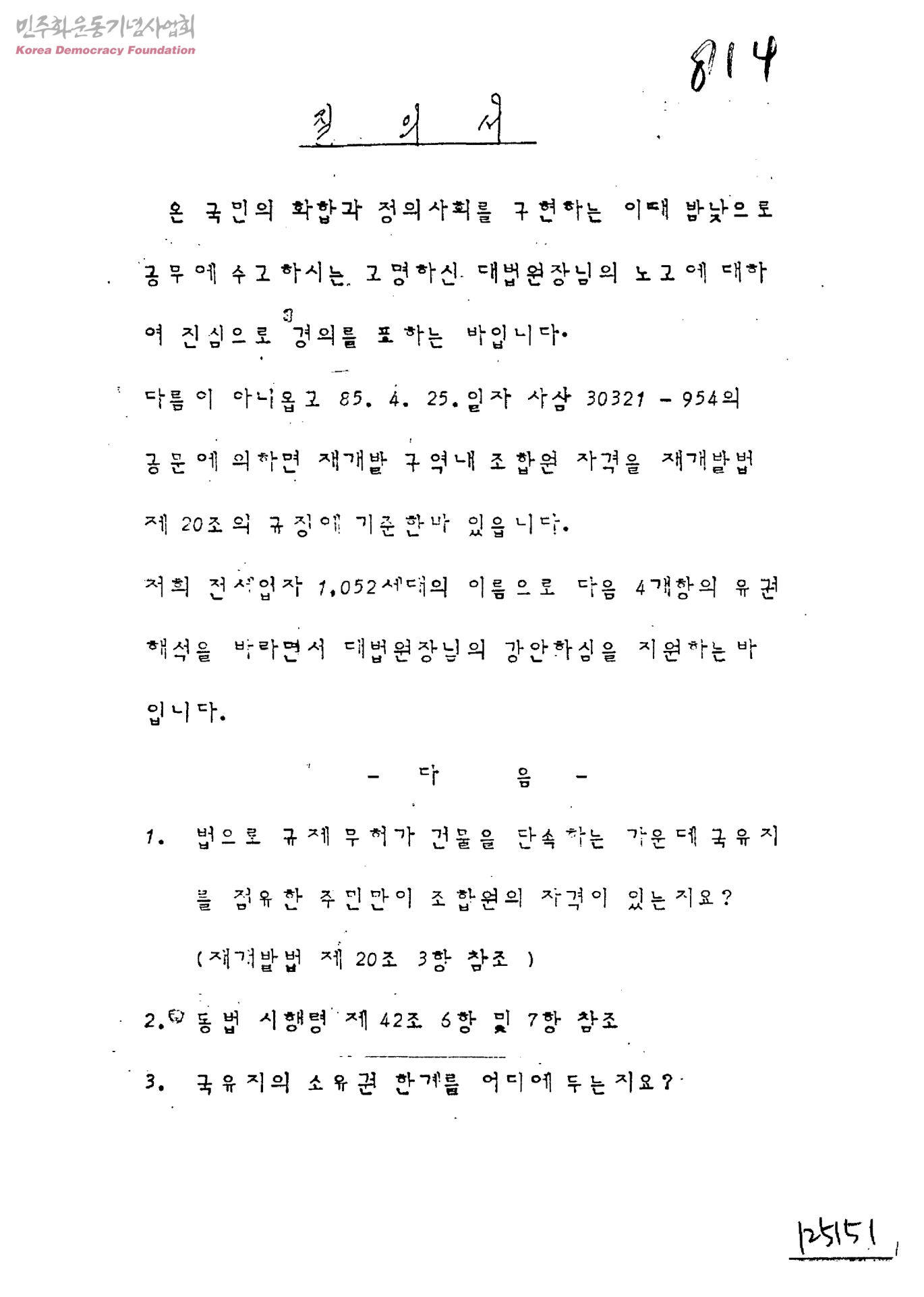 질의서[재개발 구역내 조합원 자격에 대한 내용의 질의서]