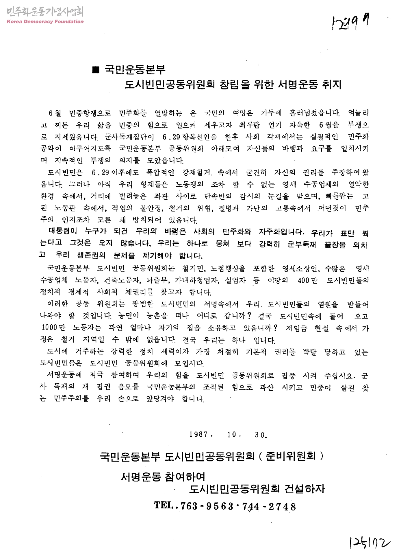 국민운동본부 도시빈민공동위원회 창립을 위한 서명운동 취지