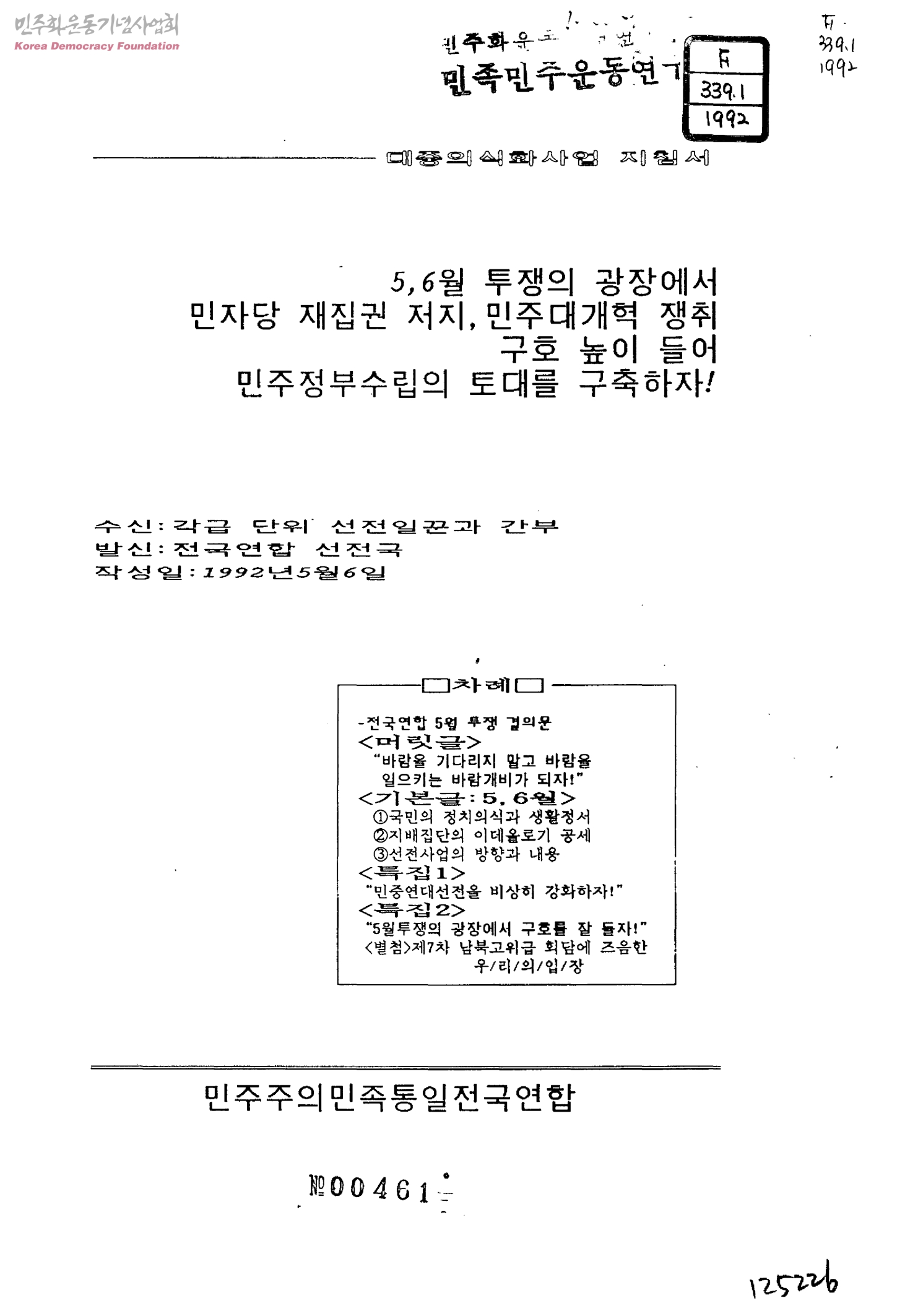대중의식화사업 지침서-5, 6월 투쟁의 광장에서 민자당 재집권 저지, 민주대개혁 쟁취 구호 높이 들어 민주정부수립의 토대를 구축하자[수신:각급 단위 선전일꾼과 간부, 발신:전국연합 선전국]