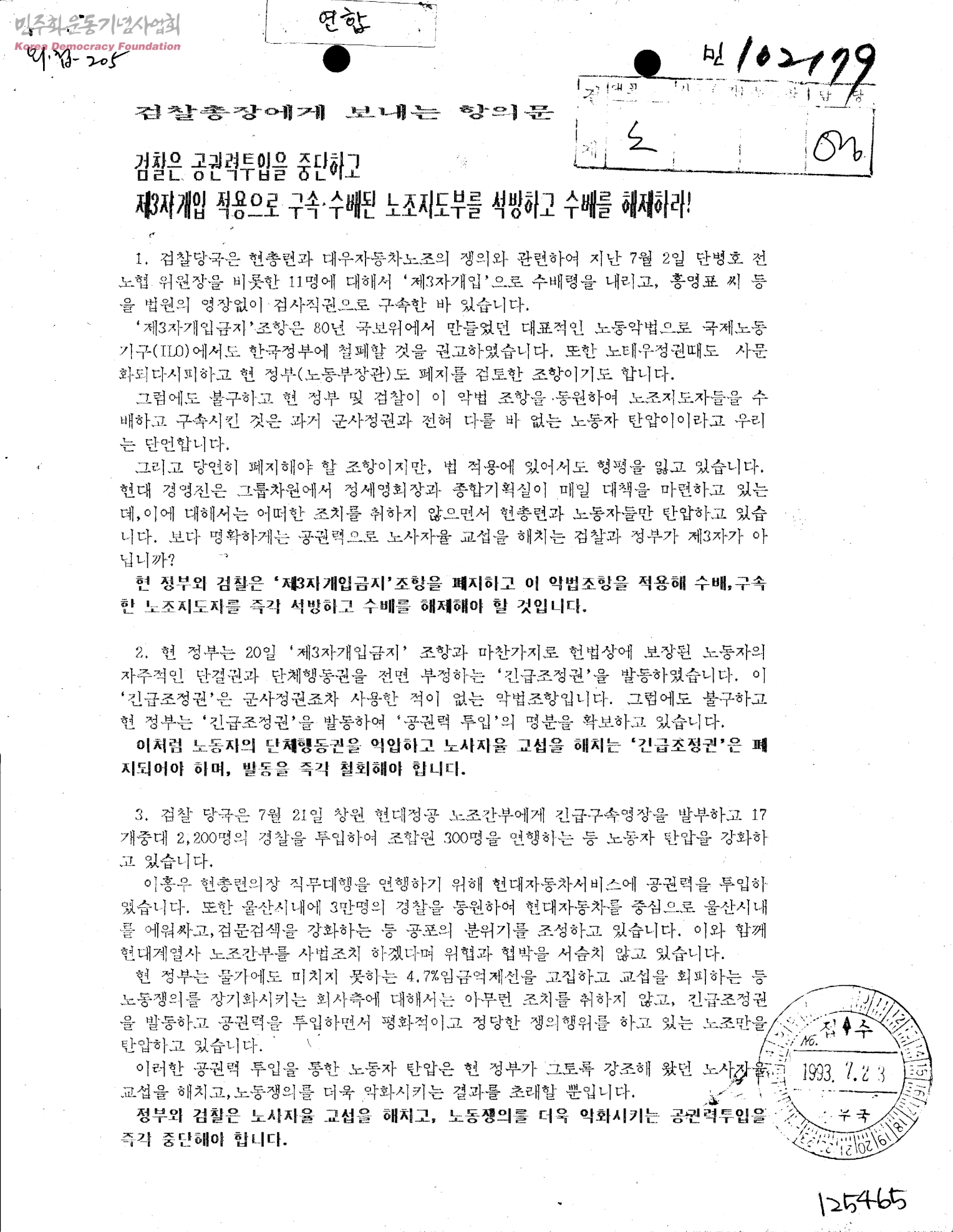 검찰총장에게 보내는 항의문-검찰은 공권력투입을 중단하고 제3자개입 적용으로 구속.수배된 노조지도부를 석방하고 수배를 해제하라