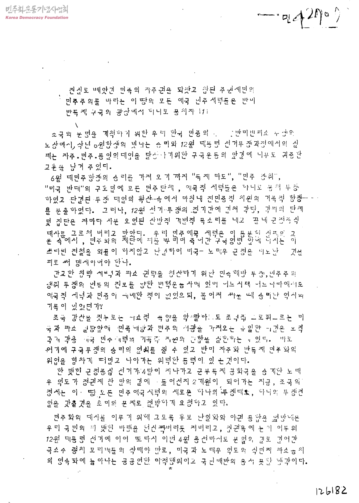 진실로 빼앗긴 민족의 자주권을 되찾고 참된 주권재민의 민주주의를 바라는 이땅의 모든 애국 민주 세력들은 반미 반독재 구국의 광장에서 하나로 뭉치자