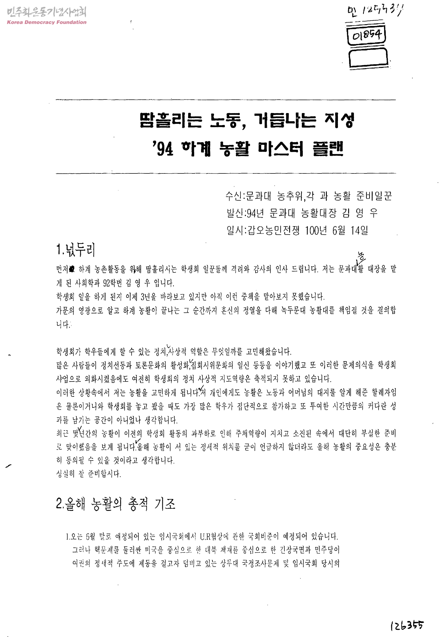 땀흘리는 노동, 거듭나는 지성 94 하계 농활 마스터 플랜[수신:문과대농추위,각과농활준비일꾼, 발신:94년문과대농활대장김영우]