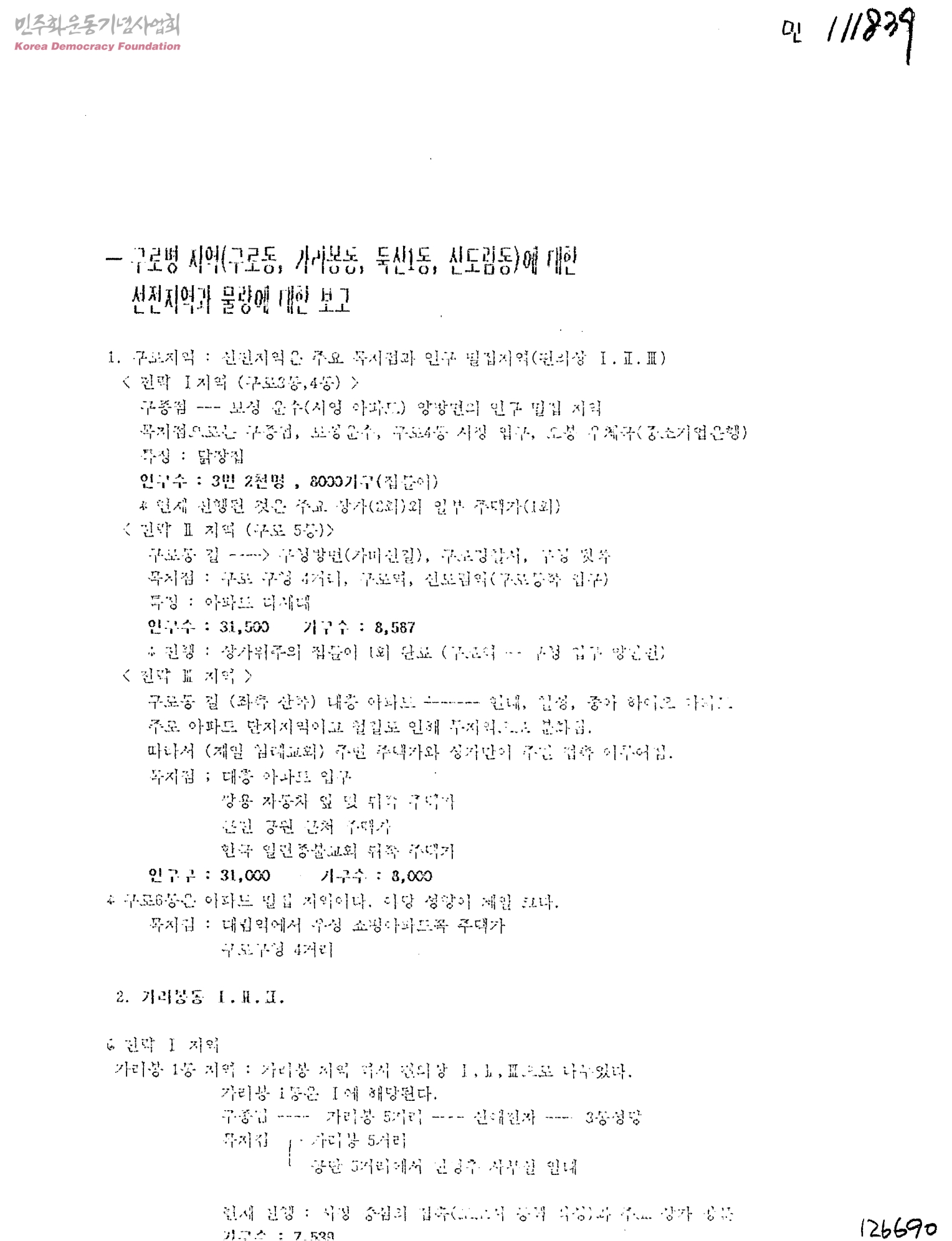 구로병(구로동, 가리봉동, 둑산1동, 신도림동)에 대한 선전지역과 물량에 대한 보고