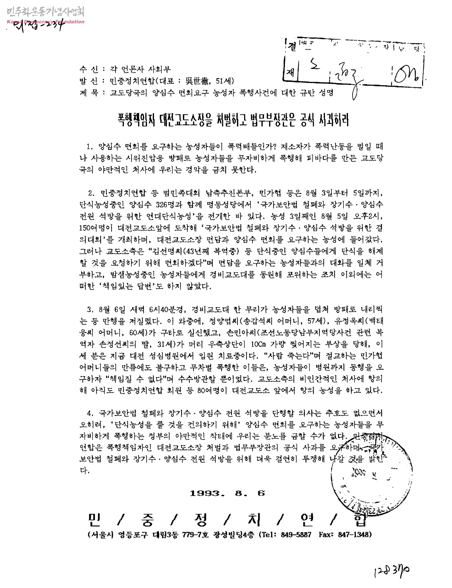 교도당국의 양심수 면회요구 농성자 폭행사건에대한 규탄 성명[수신:각 언론사 사회부, 발신:민중정치연합]