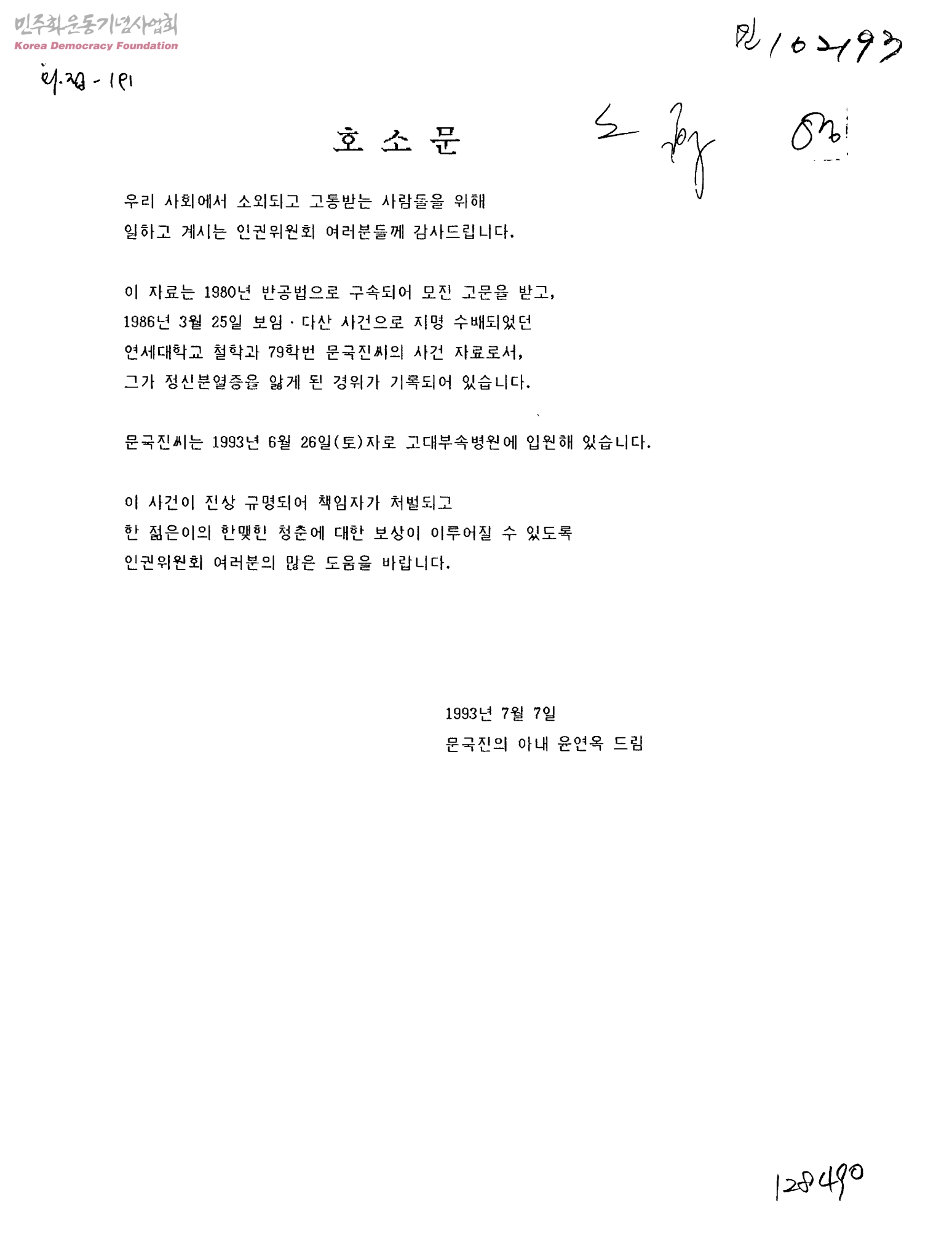 호소문[반공법으로 구속된 문국진씨의 사건 자료로서 이 사건의 진상규명 요구 관련]