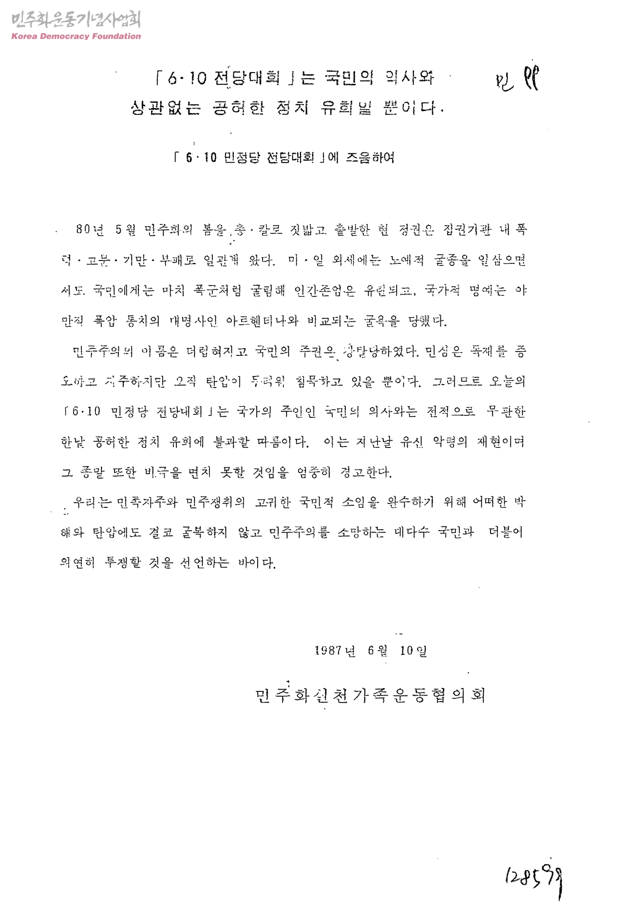 6 ·10전당대회는 국민의 의사와 상관없는 공허한 정치 유희일 뿐이다-6.10 민정당 전당대회에 즈음하여