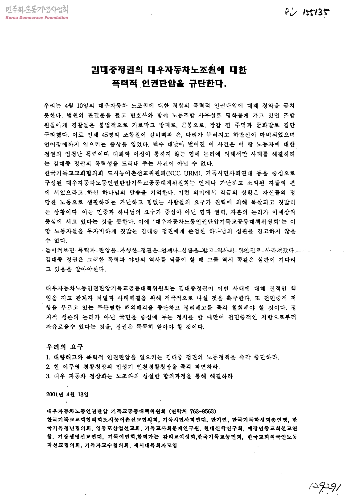 김대중정권의 대우자동차노조원에 대한 폭력적 인권탄압을 규탄한다