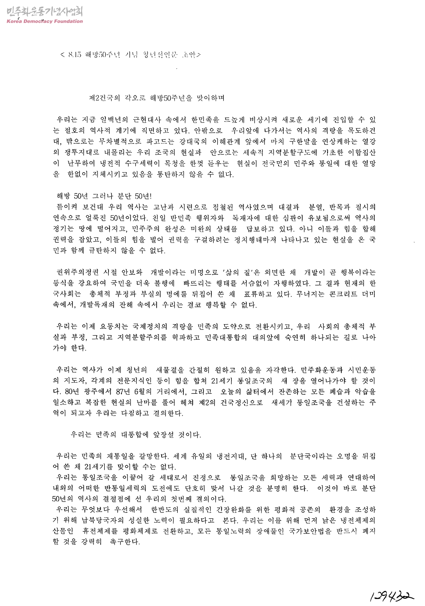 제2건국의 각오로 해방50주년을 맞이하며-8.15 해방50주년 기념 청년선언문 초안