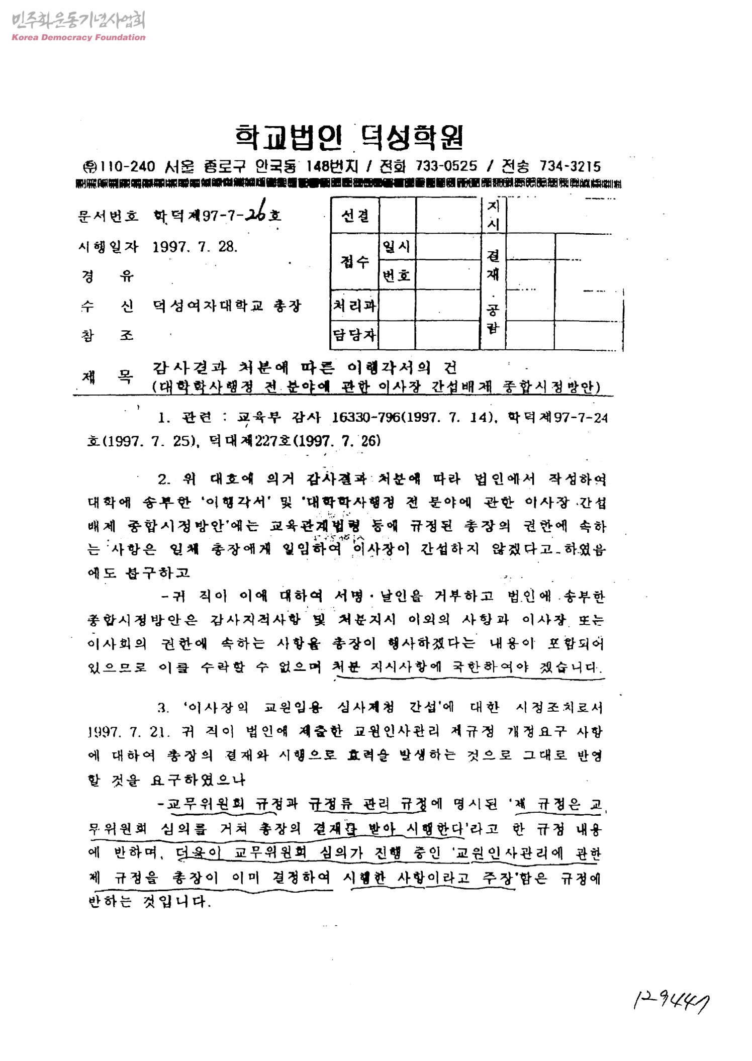 감사결과 처분에 따른 이행각서의 건-대학학사행정 전 분야에 관한 이사장 간섭배제 종합시정방안[수신:덕성여자대학교총장, 발신:학교법인 덕성학원 이사장]