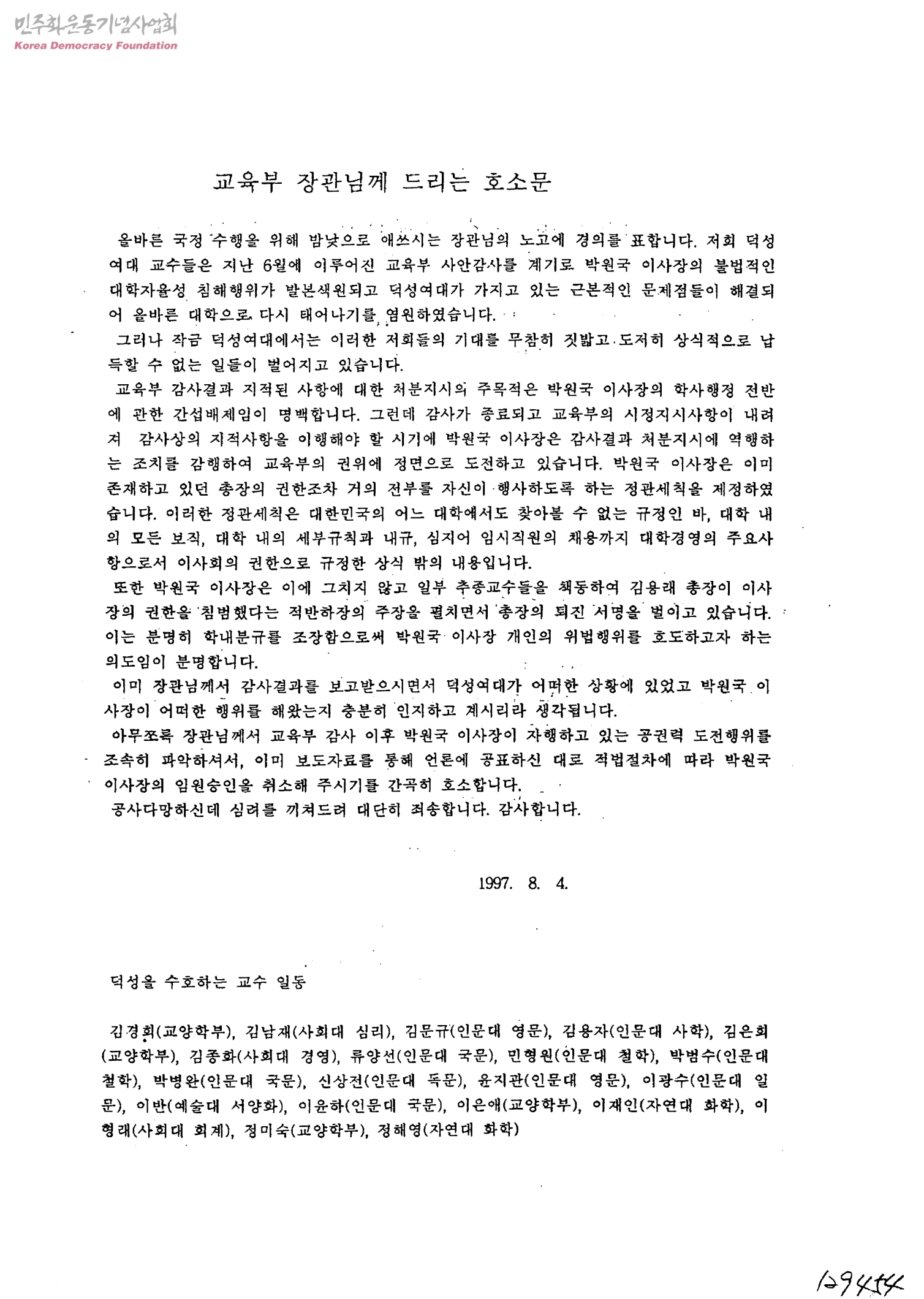 - 덕성을수호하는교수일동(김경희(교양학부), 김남재(사회대 심리), 김문규(인문대 영문), 김용자(인문대 사학), 김은희(교양학부), 김종화(사회대 경영), 류양선(인문대 국문), 민형원(인문대 철학), 박범수(인문대 철학), 박병완(인문대 국문), 신상전(인문대 독문), 윤지관(인문대 영문), 이광수(인문대 일문), 이반(예술대 서양화), 이윤하(인문대 국문), 이은애(교양학부), 이재인(자연대 화학), 이형래(사회대 회계), 정미숙(교양학부), 정해영(자연대 화학))