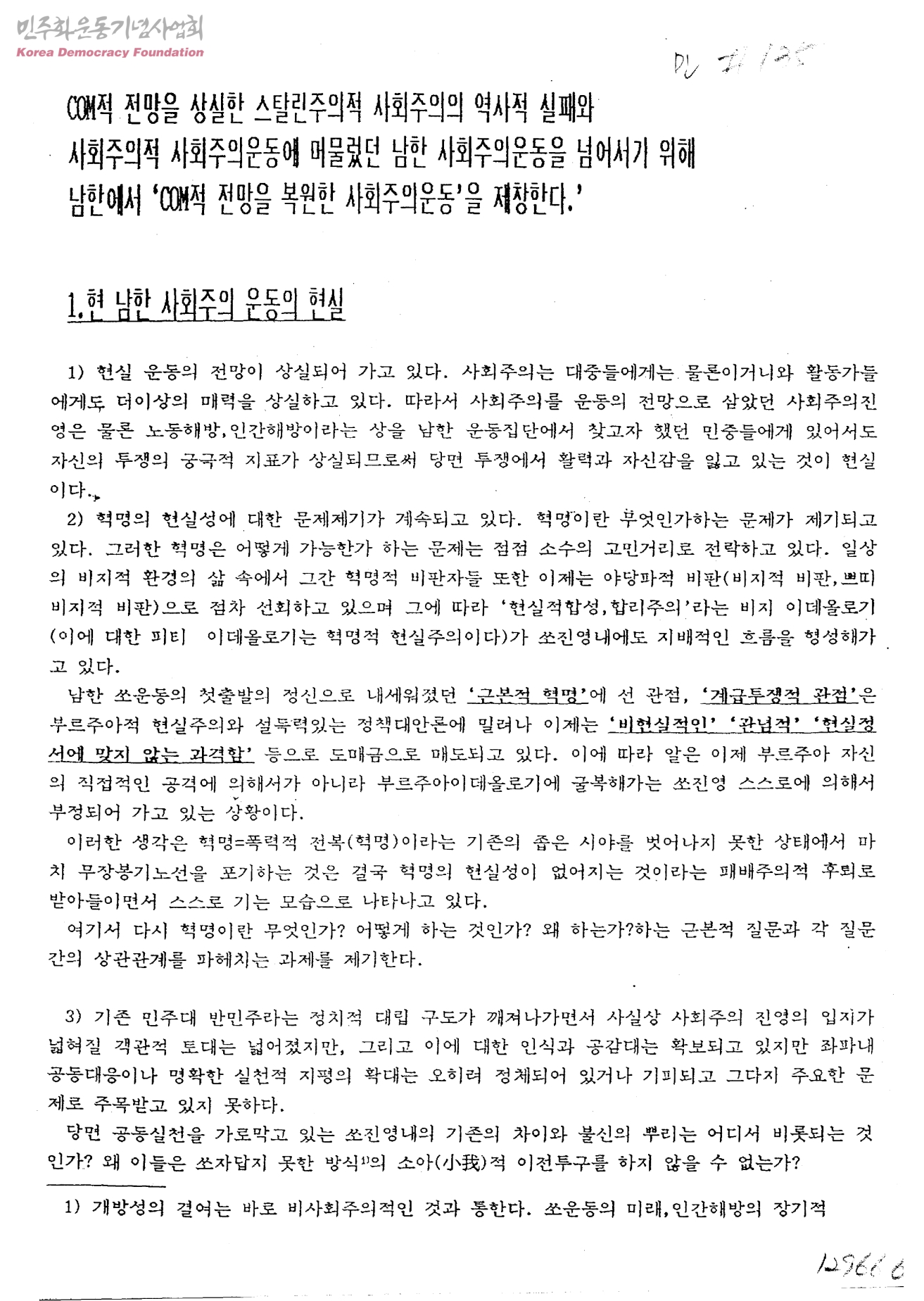 COM적 전망을 상실한 스탈린주의적 사회주의의 역사의 실패와 사회주의적 사회주의운동에 머물렀던 남한 사회주의운동을 넘어서기 위해 남한에서 'COM적 전망을 복원한 사회주의운동'을 제창한다