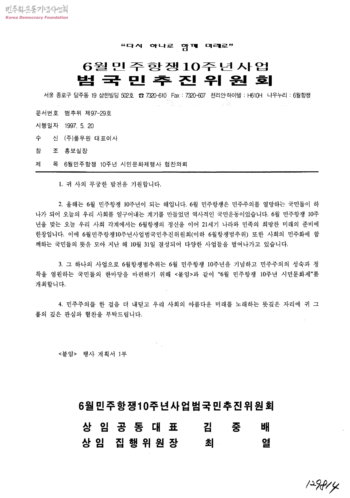 6월민주항쟁 10주년 시민문화제행사 협찬의뢰[수신:(주)풀무원 대표이사]