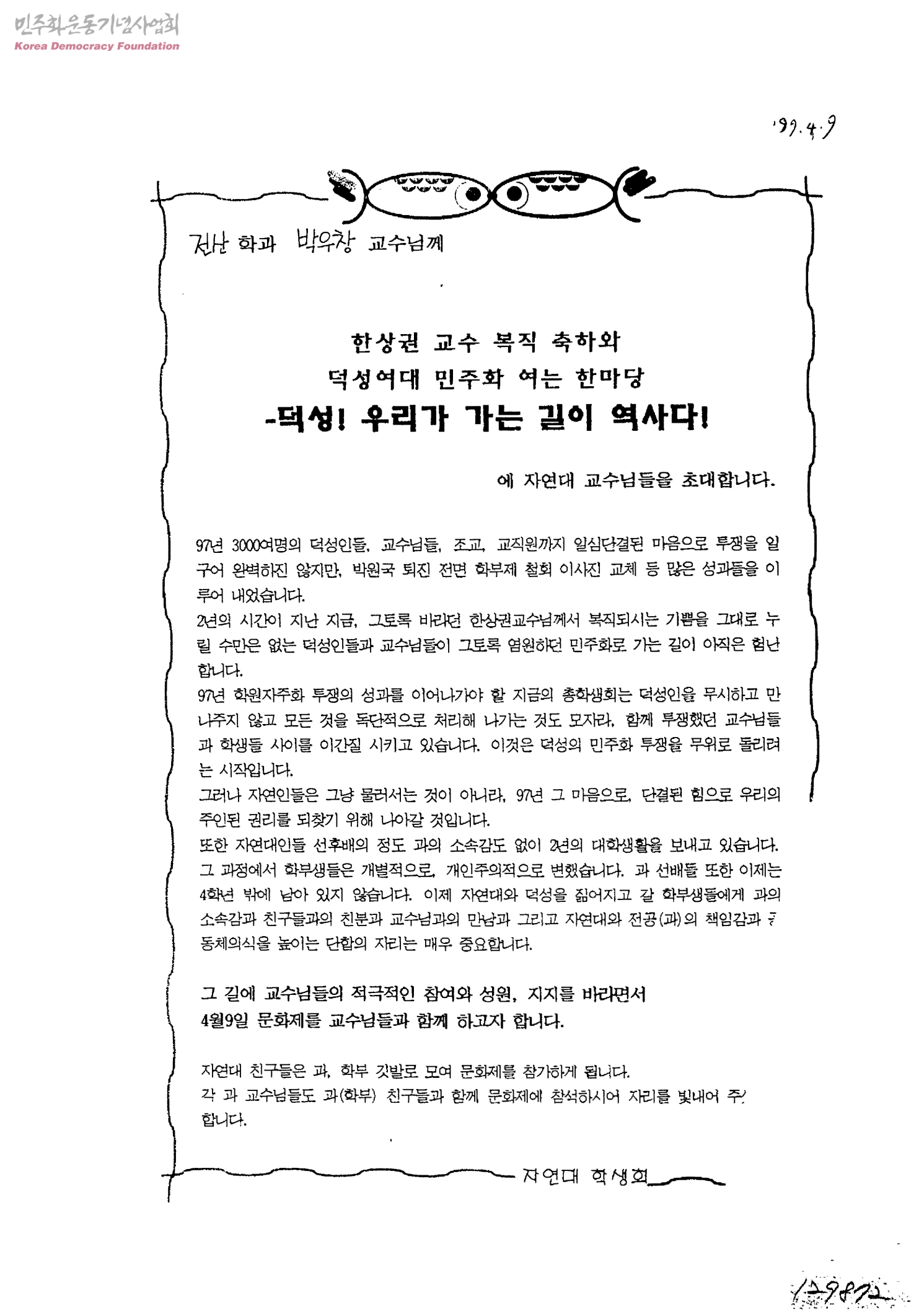 한상권 교수 복직 축하와 덕성여대 민주화 여는 한마당-덕성! 우리가 가는 길이 역사다[전산학과 박우창교수님께]
